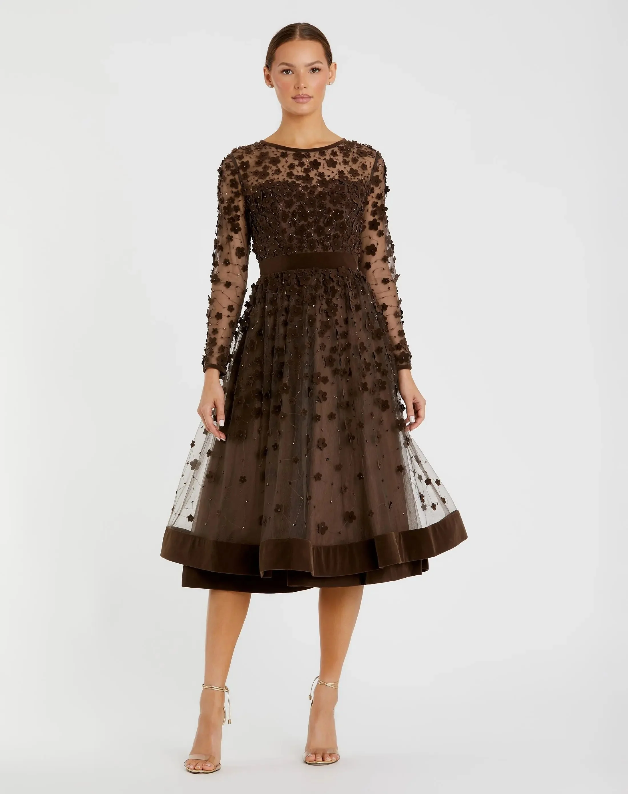 Embellished Illusion High Neck Long Sleeve Fit & Flare Dress