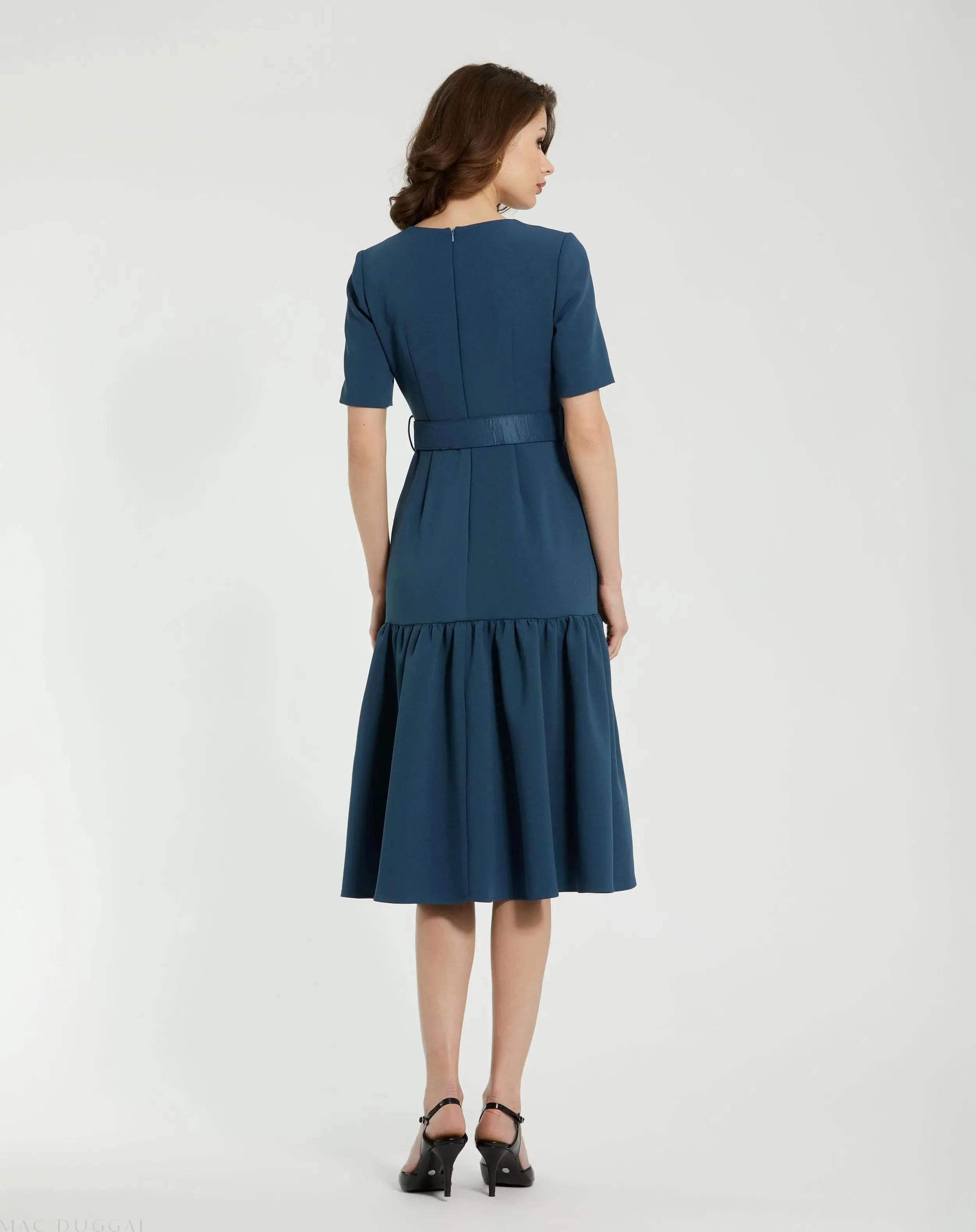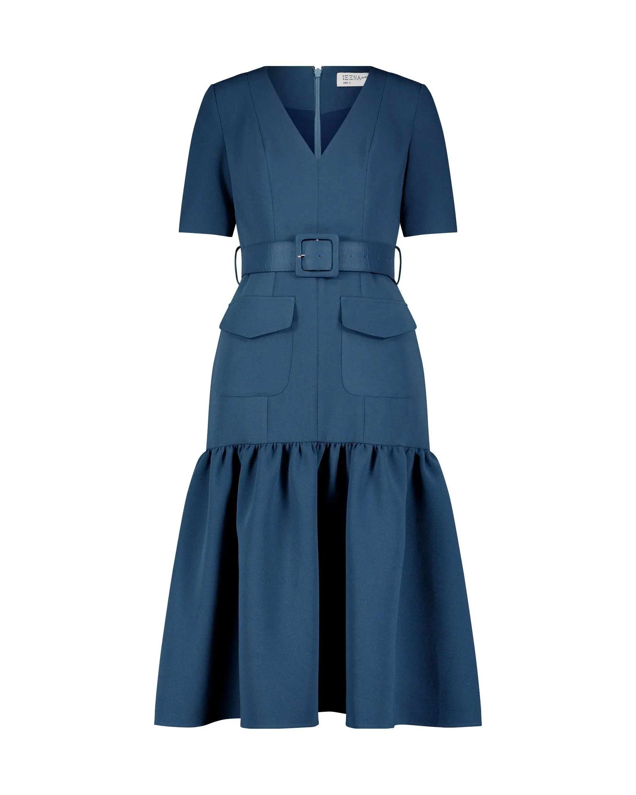 Blue Crepe 3/4 Sleeve Midi Dress With Belt And Pockets