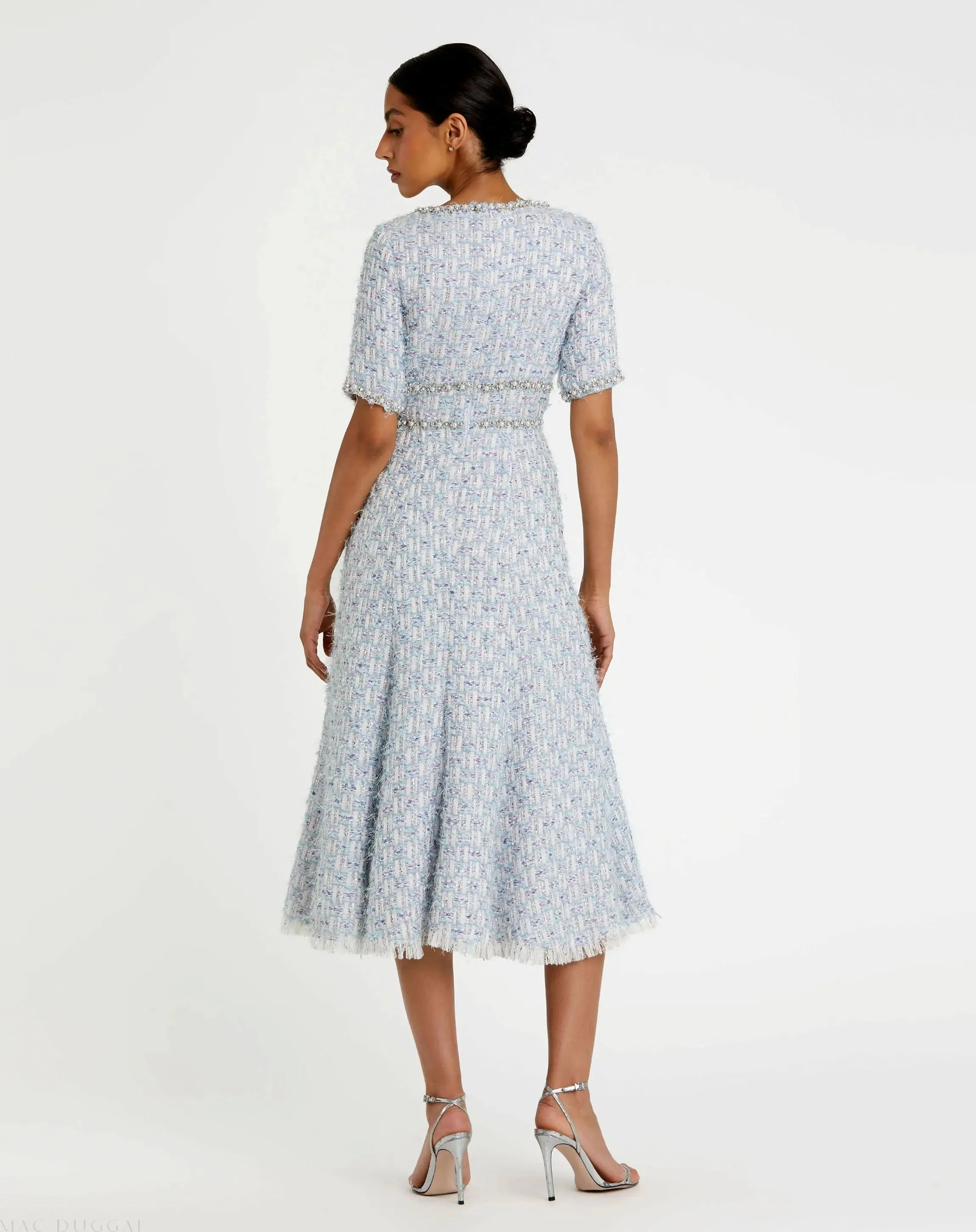 Blue Short Sleeve Beaded Trim Boucle Midi Dress