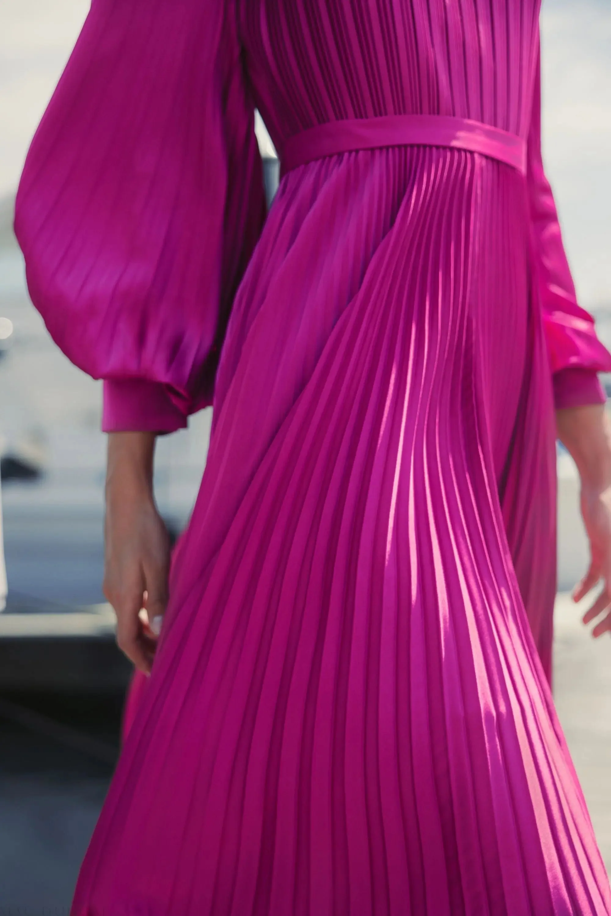 Purple Long Sleeve Pleated Charmeuse Handkerchief Dress