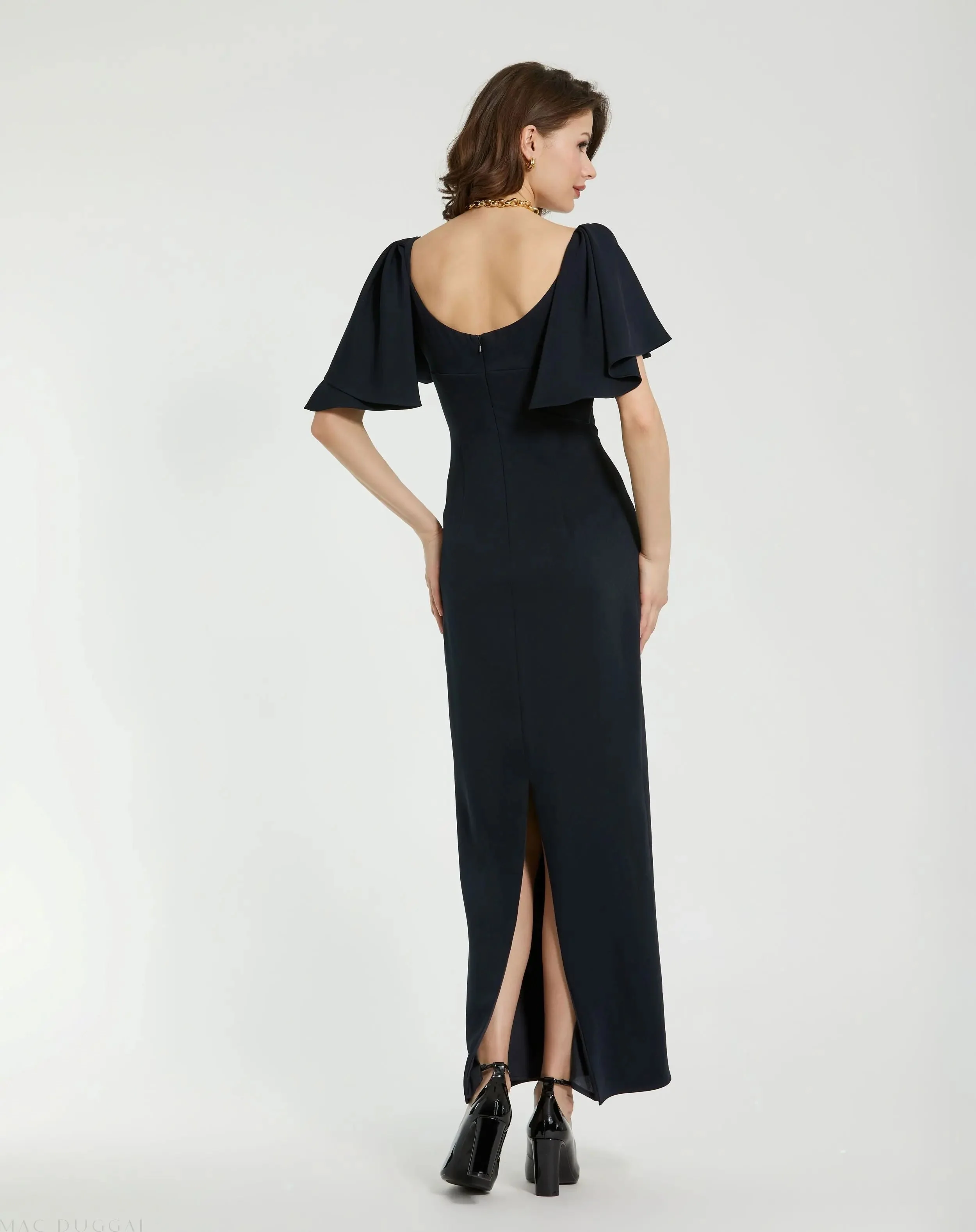 Navy Crepe Fitted Column Dress With Short Ruffle Sleeves - FINAL SALE