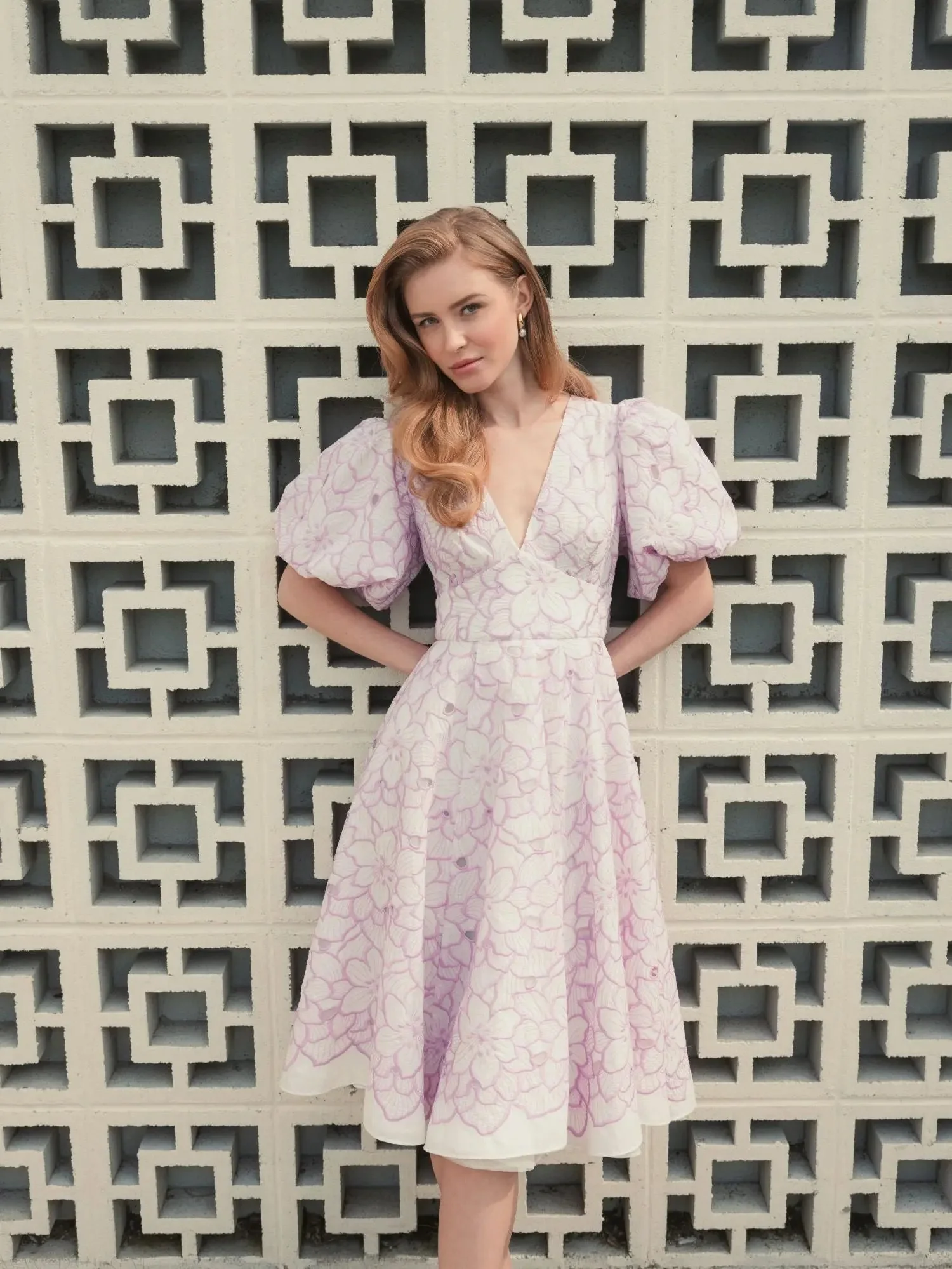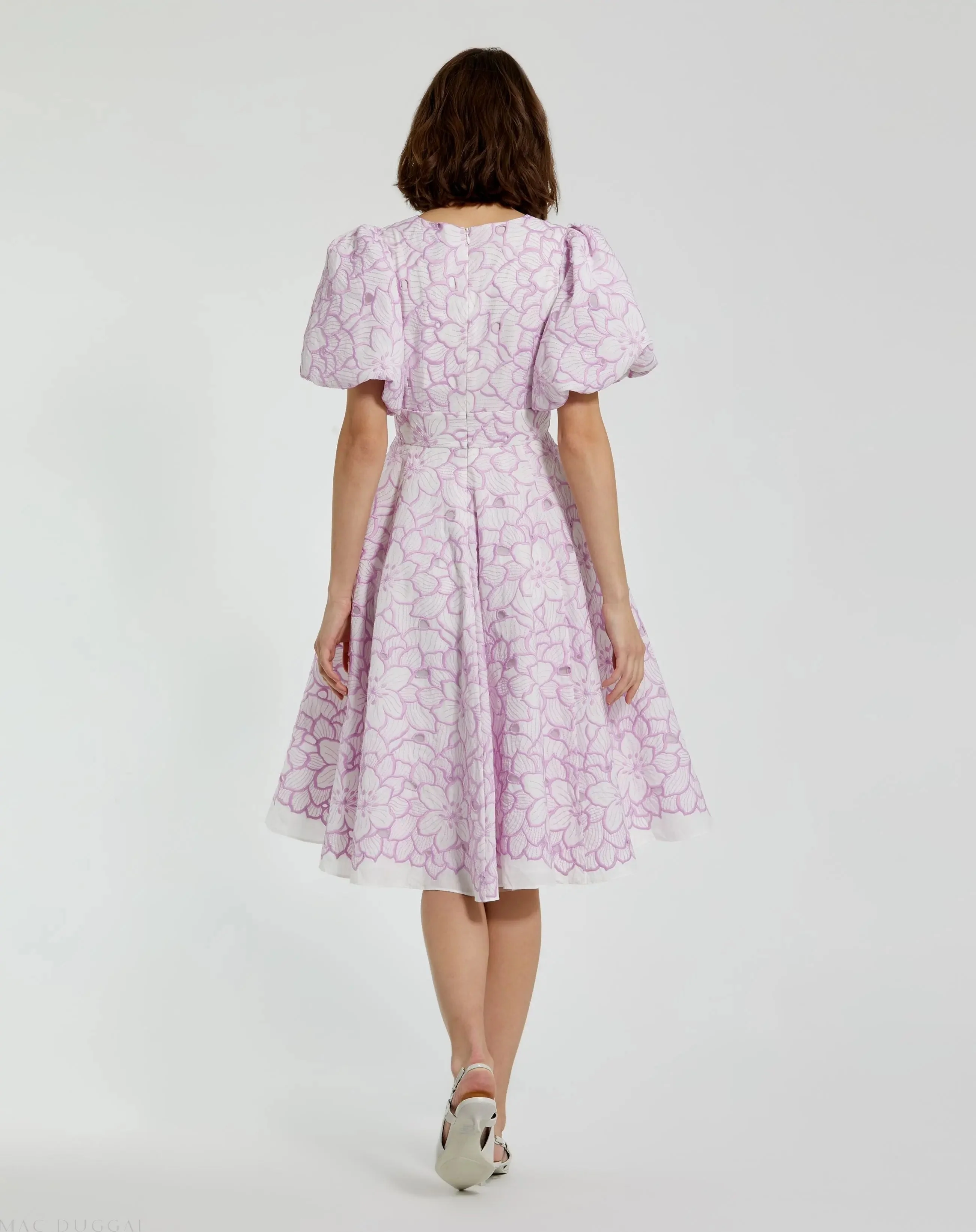 Multicolor Embroidered Floral Puff Sleeve Midi Dress