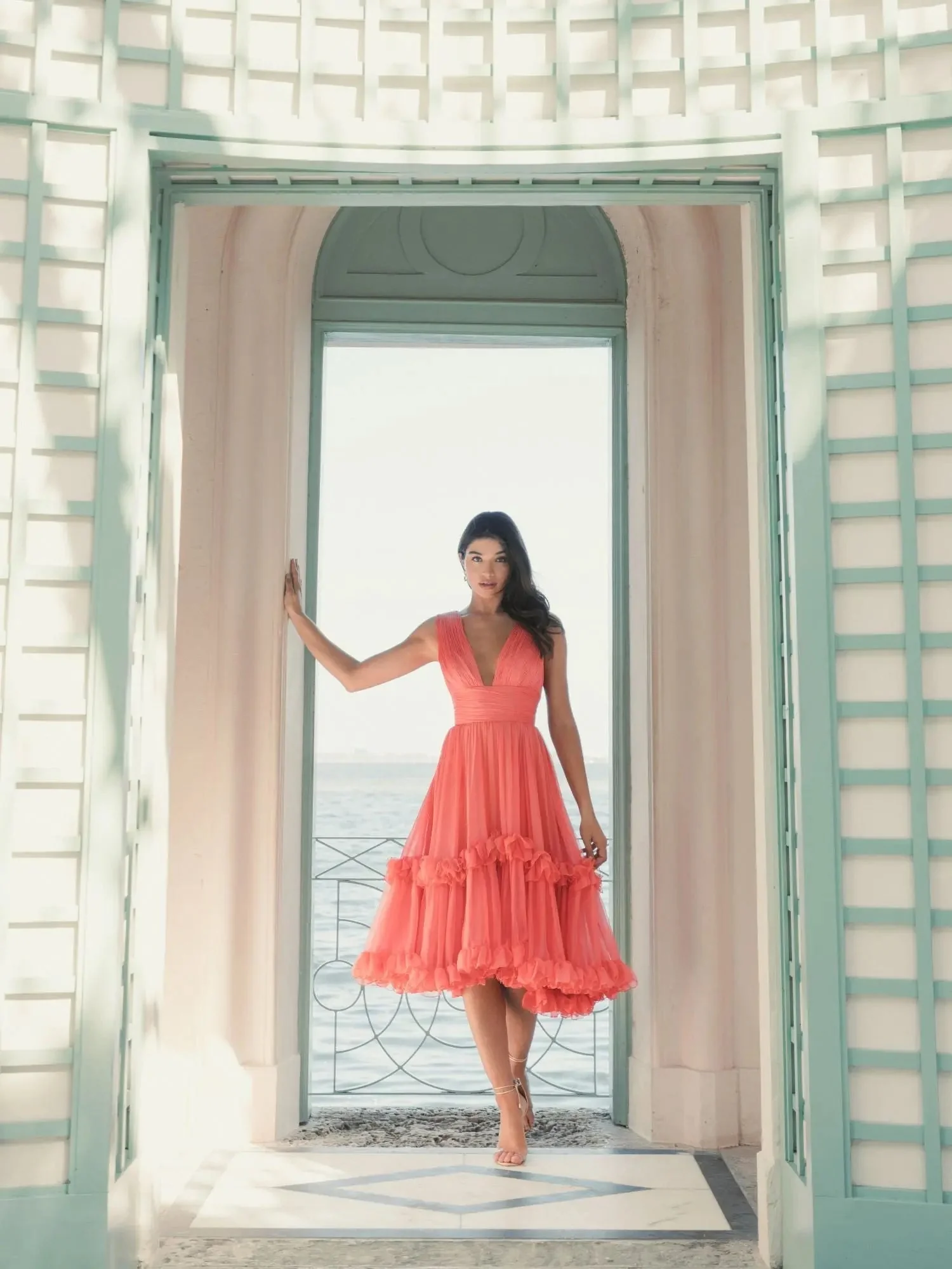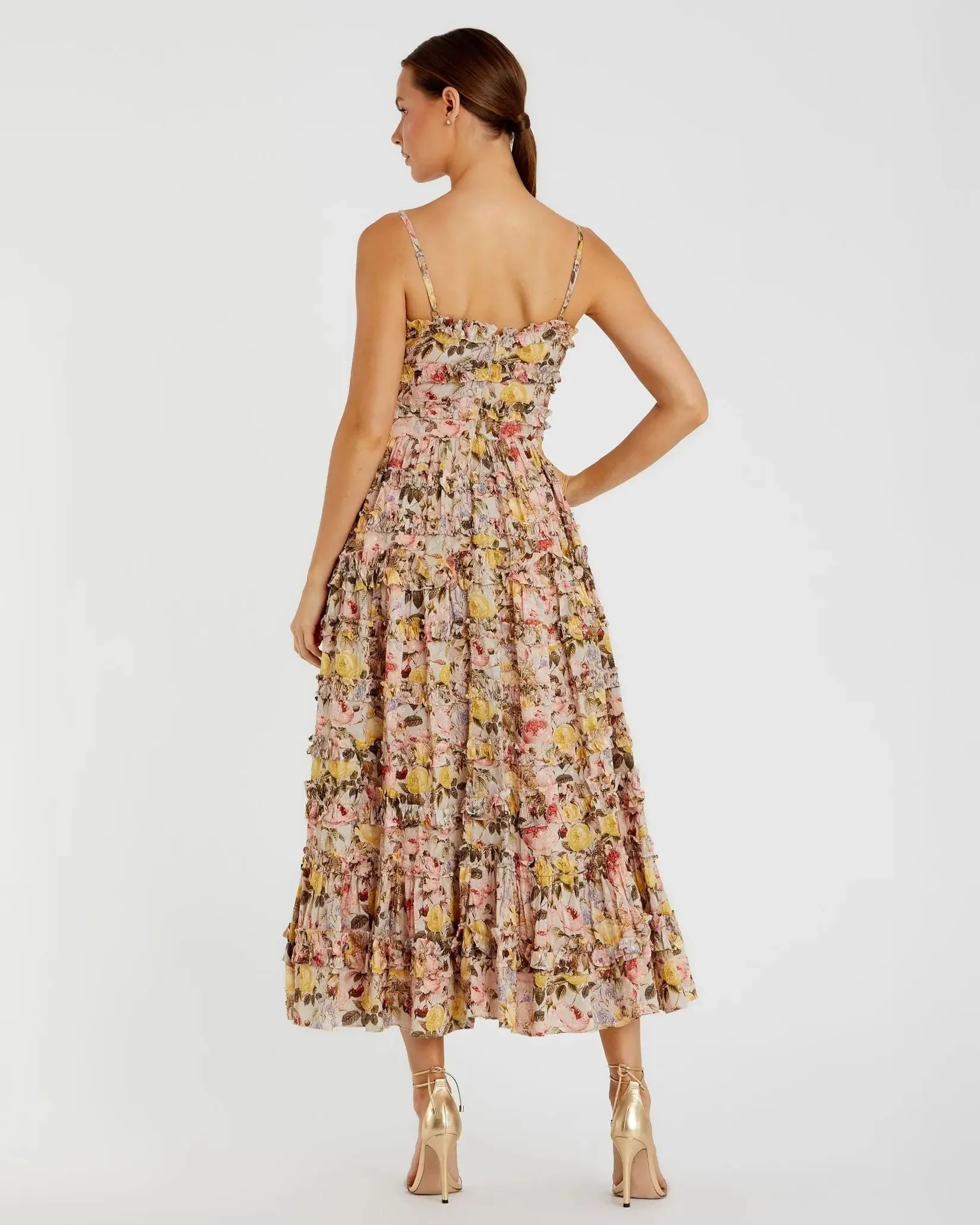 Orange V-Neck Sleeveless Tiered Ruffle Midi Dress