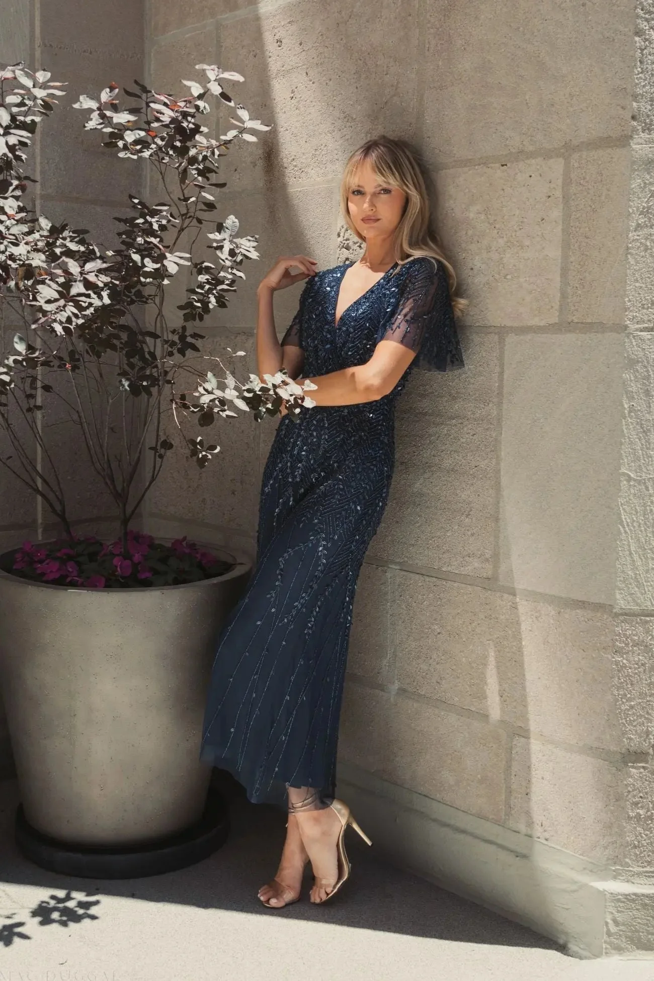 Navy Beaded Wrap Over Butterfly Sleeve Dress