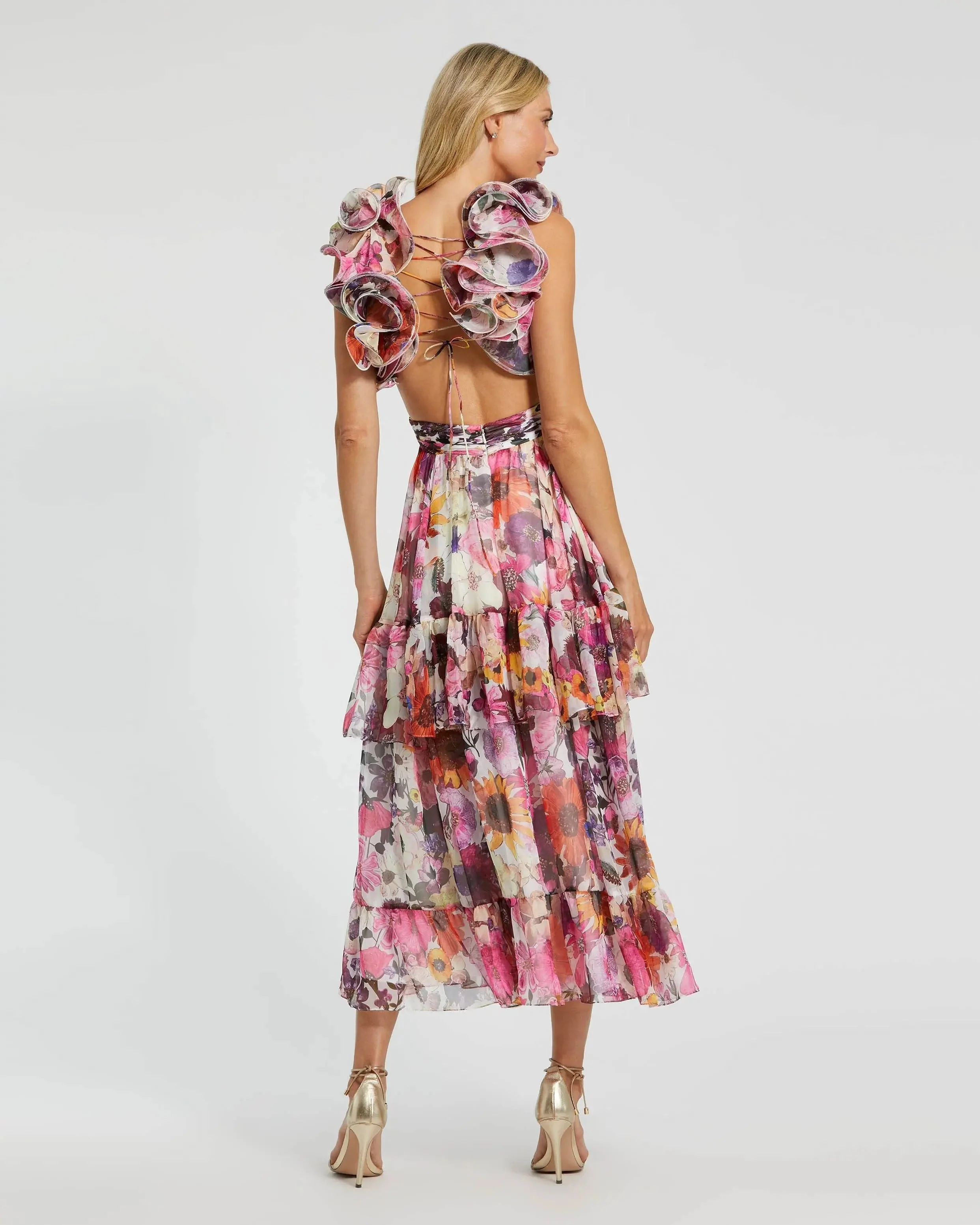 White Floral Chiffon Ruffle Tiered Cut-Out Midi Dress