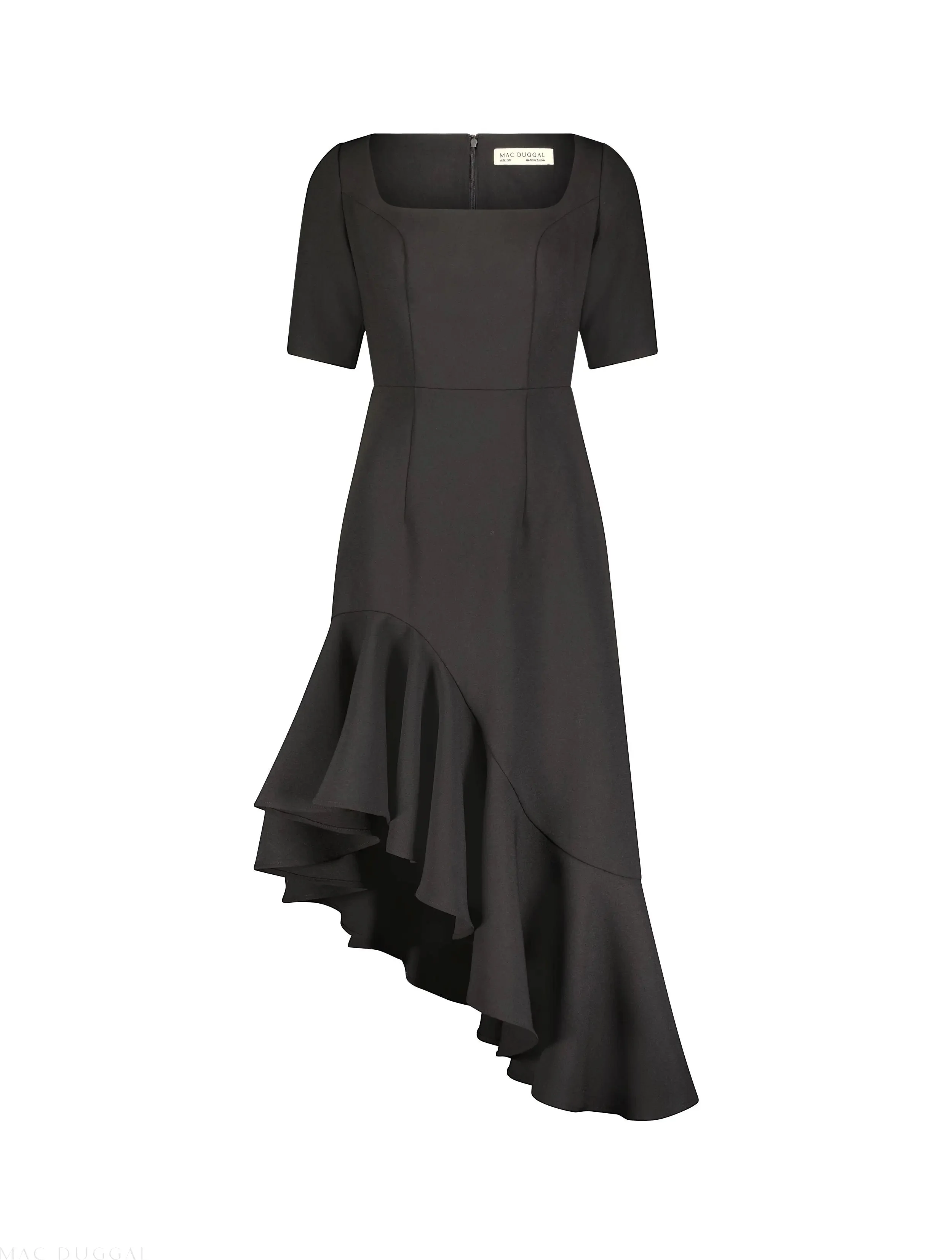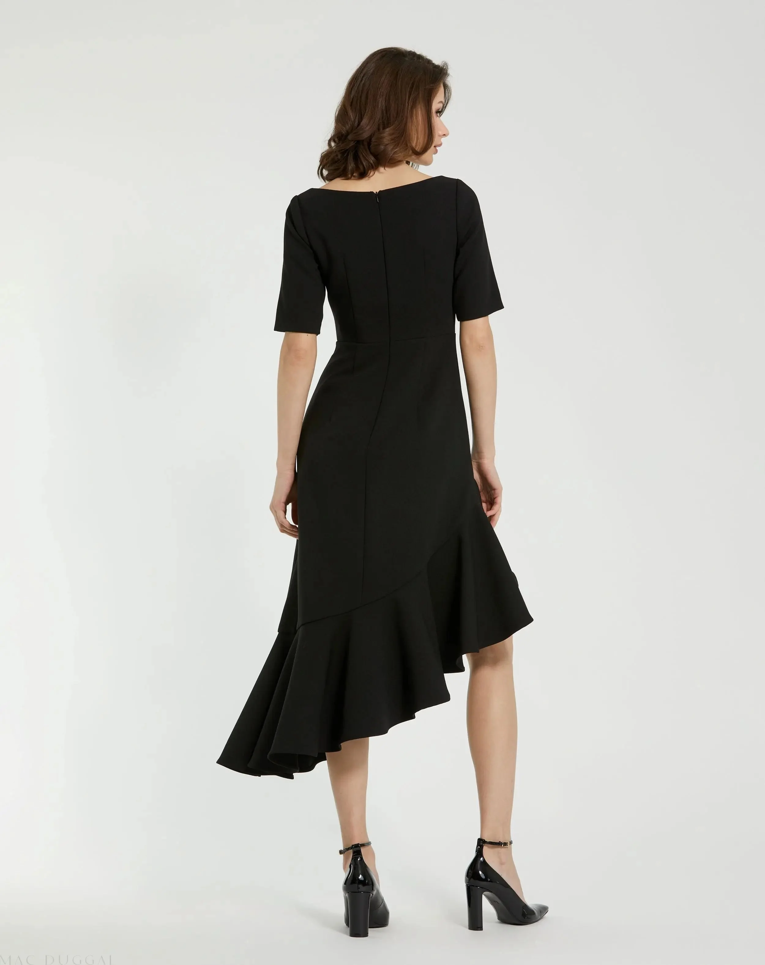 Black Crepe 3/4 Sleeve Asymmetrical Hem Dress