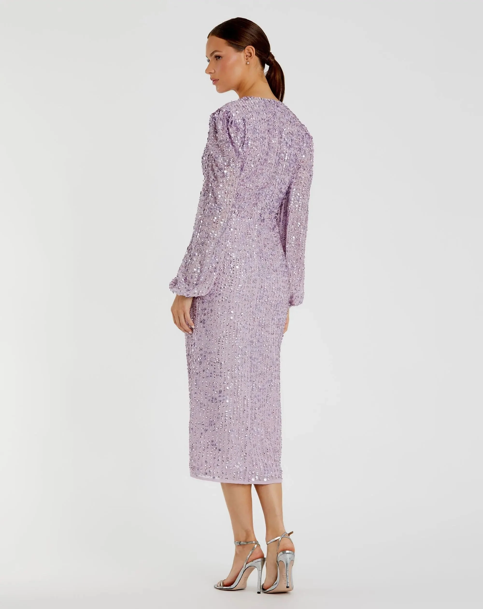 Purple Sequined Illusion Puff Sleeve V Neck Midi Dress