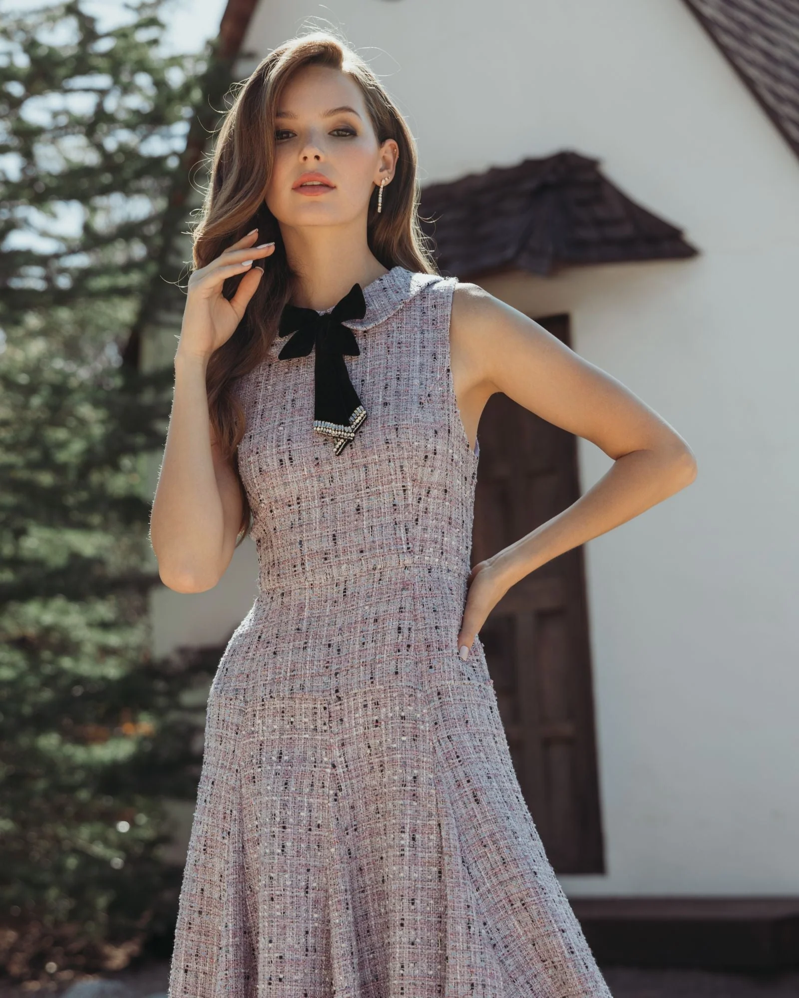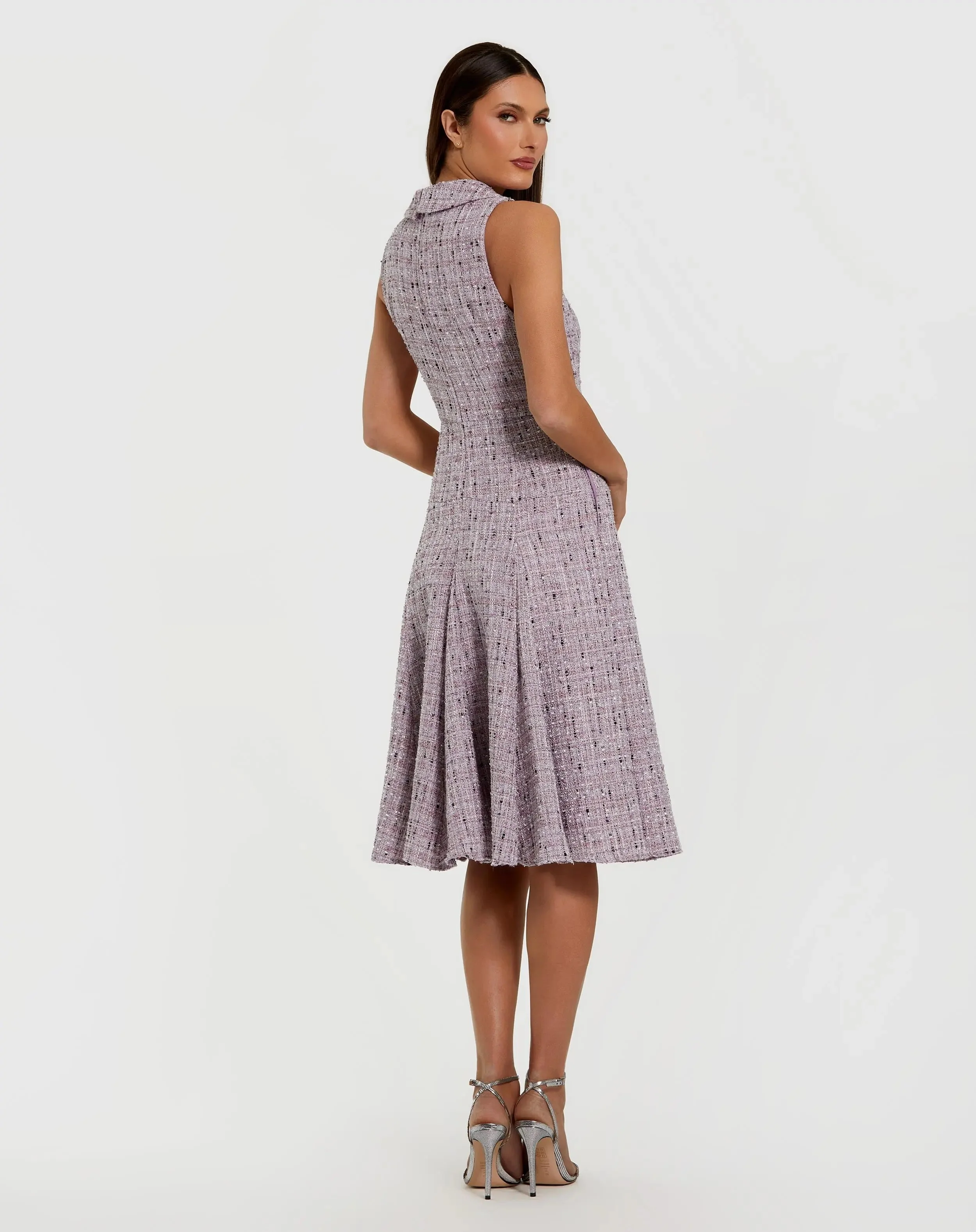 Purple Sleeveless Boucle A-Line Midi Dress With Bow