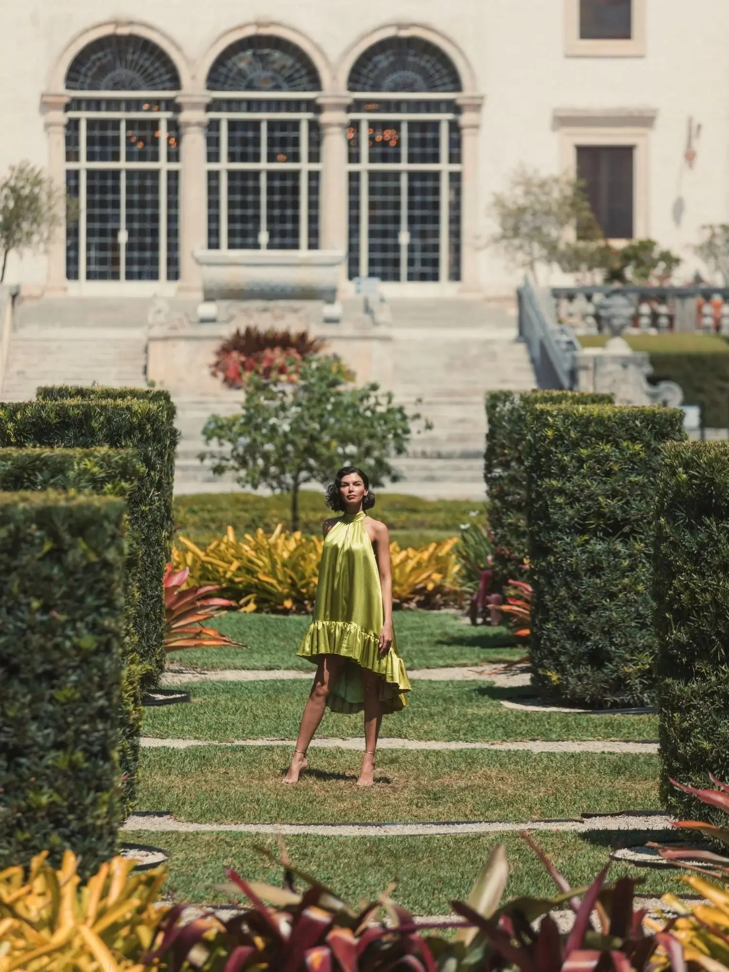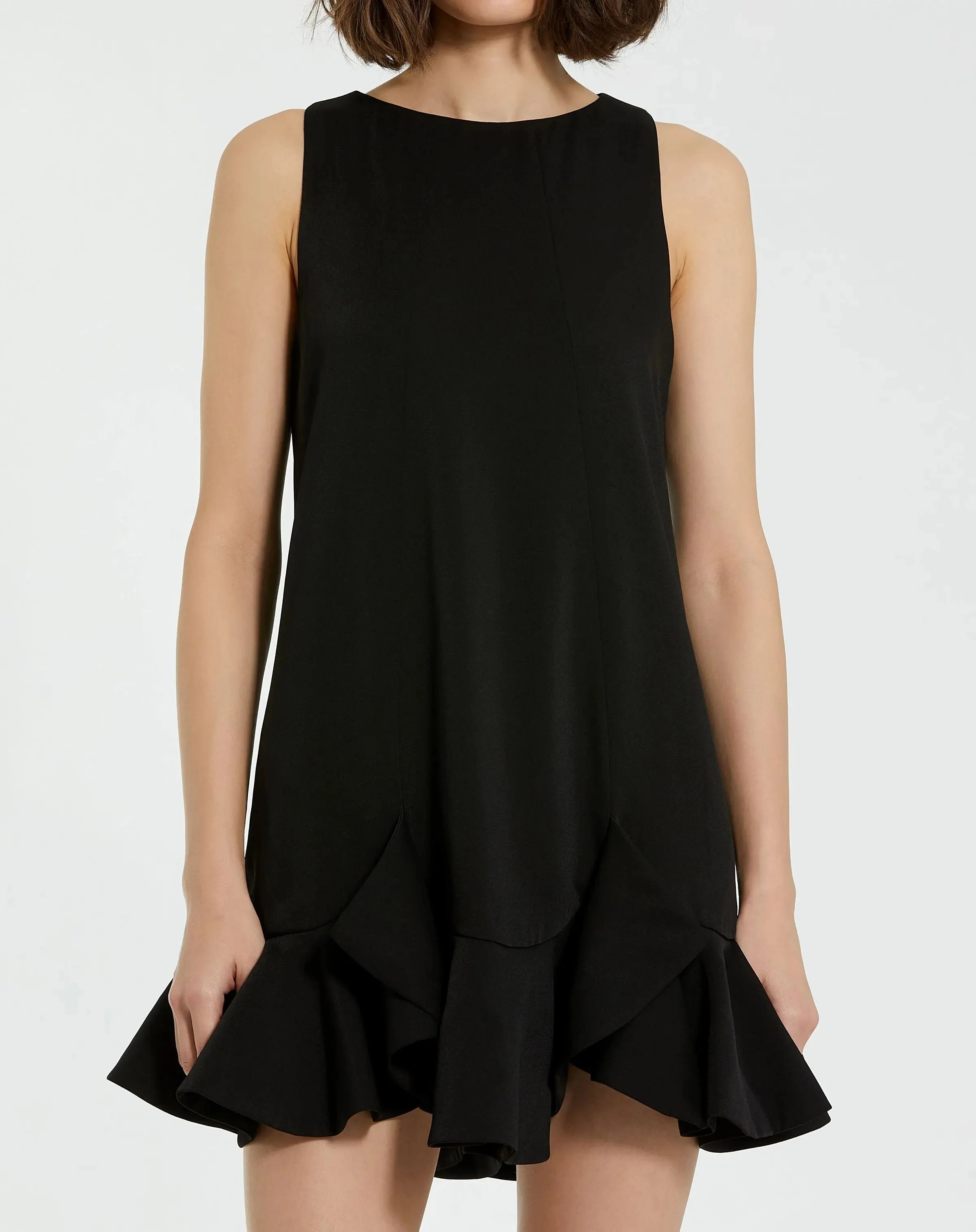 The Mia Black High Neck Sleeveless Crepe Mini Dress With Ruffle Hem