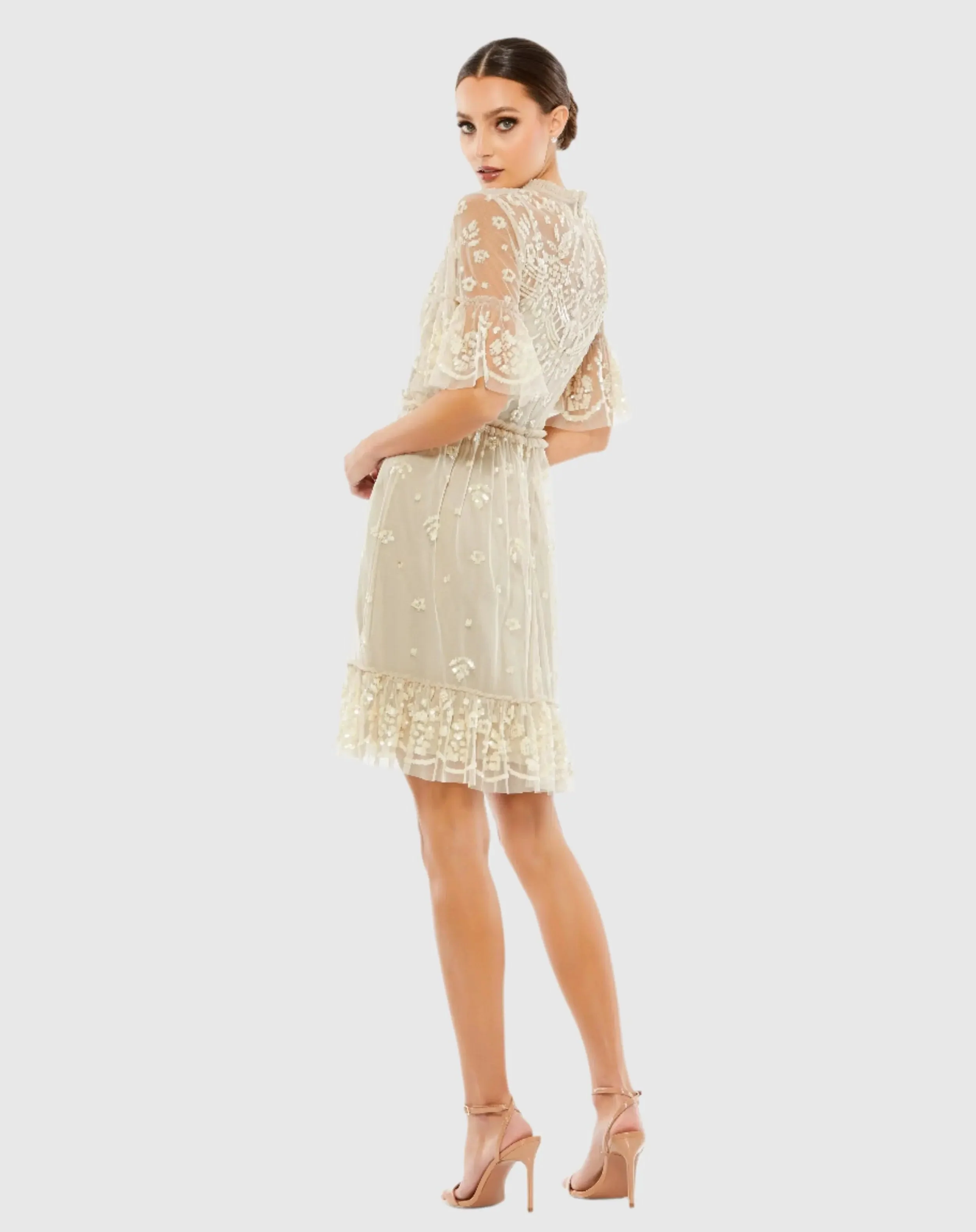 Beige Embellished Illusion High Neck Mini Dress
