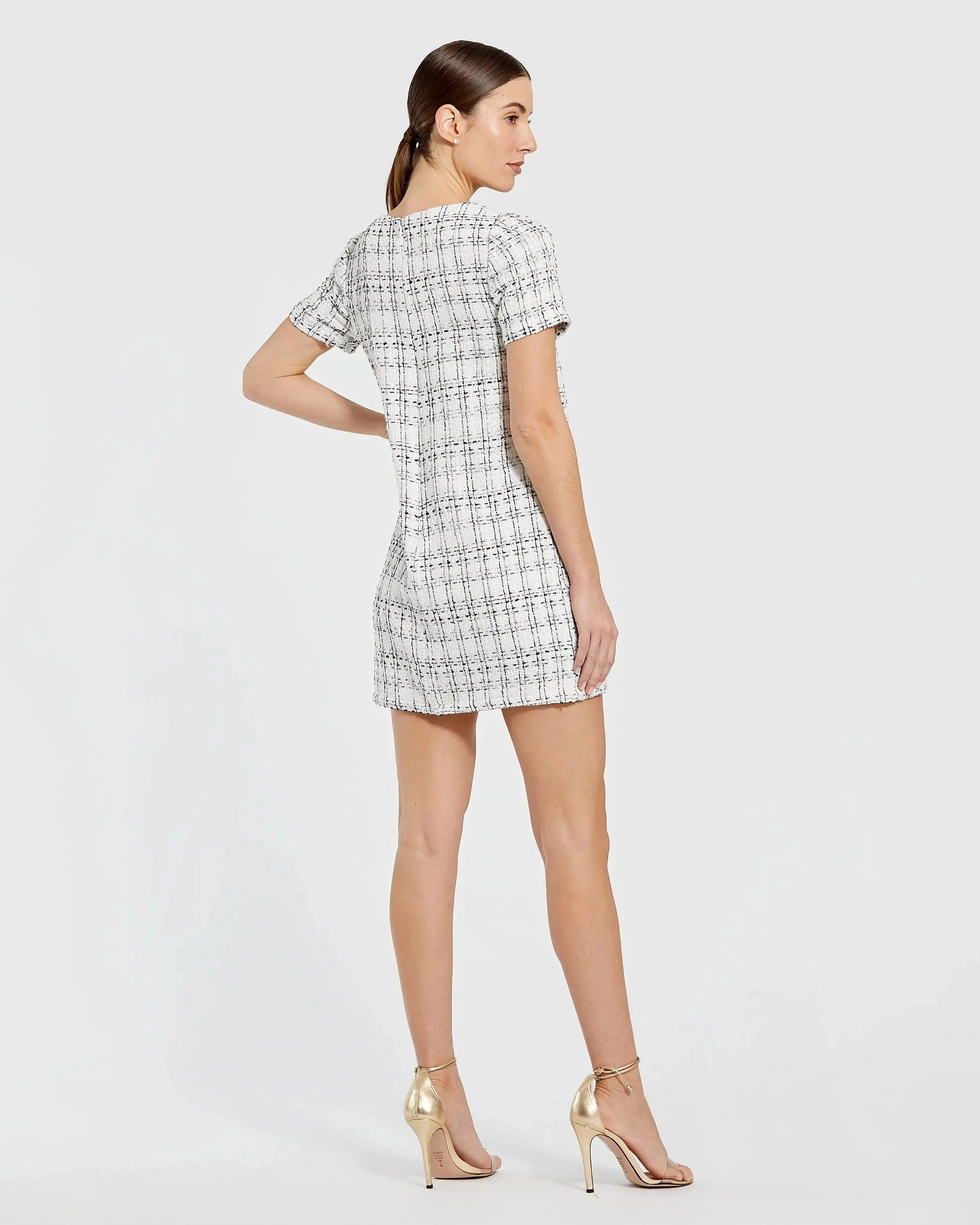 White Short Sleeve High Neck Boucle Mini Dress With Bow