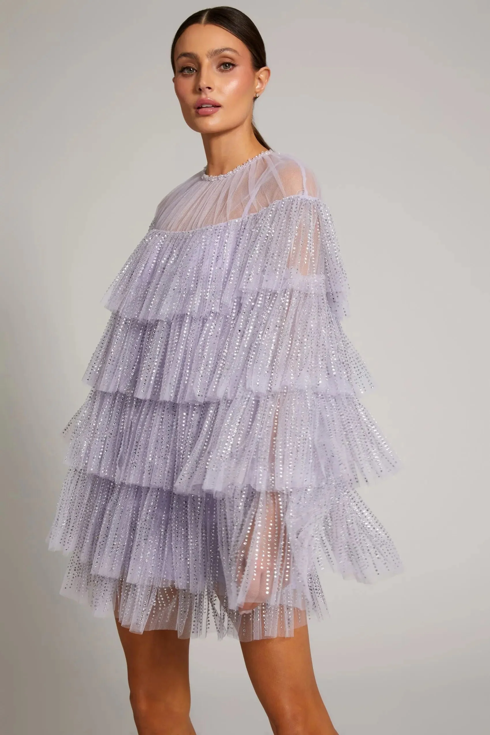 Purple Embellished High Neck Ruffle Mini Dress