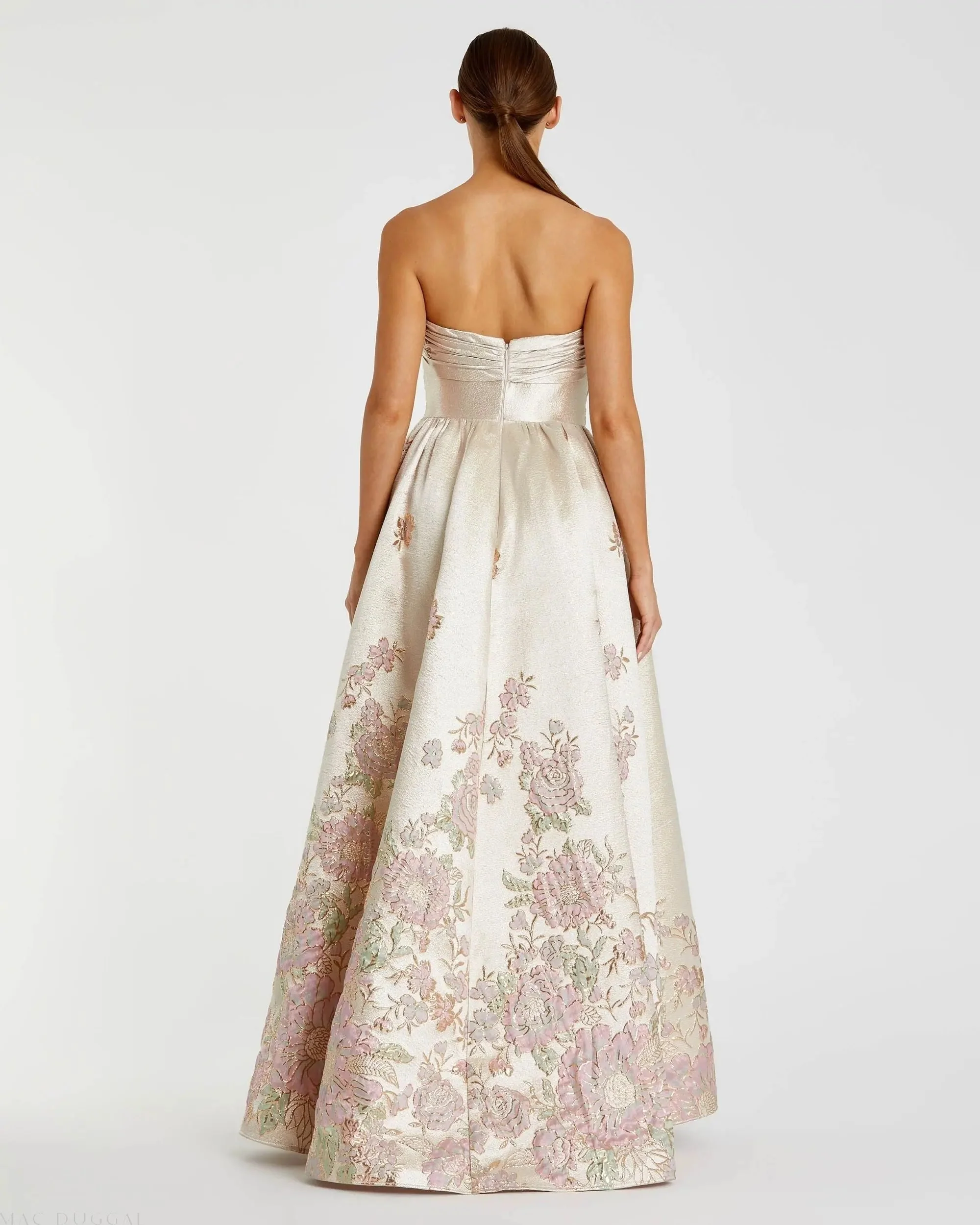 Brocade Strapless Floral Gown With Bow Detail