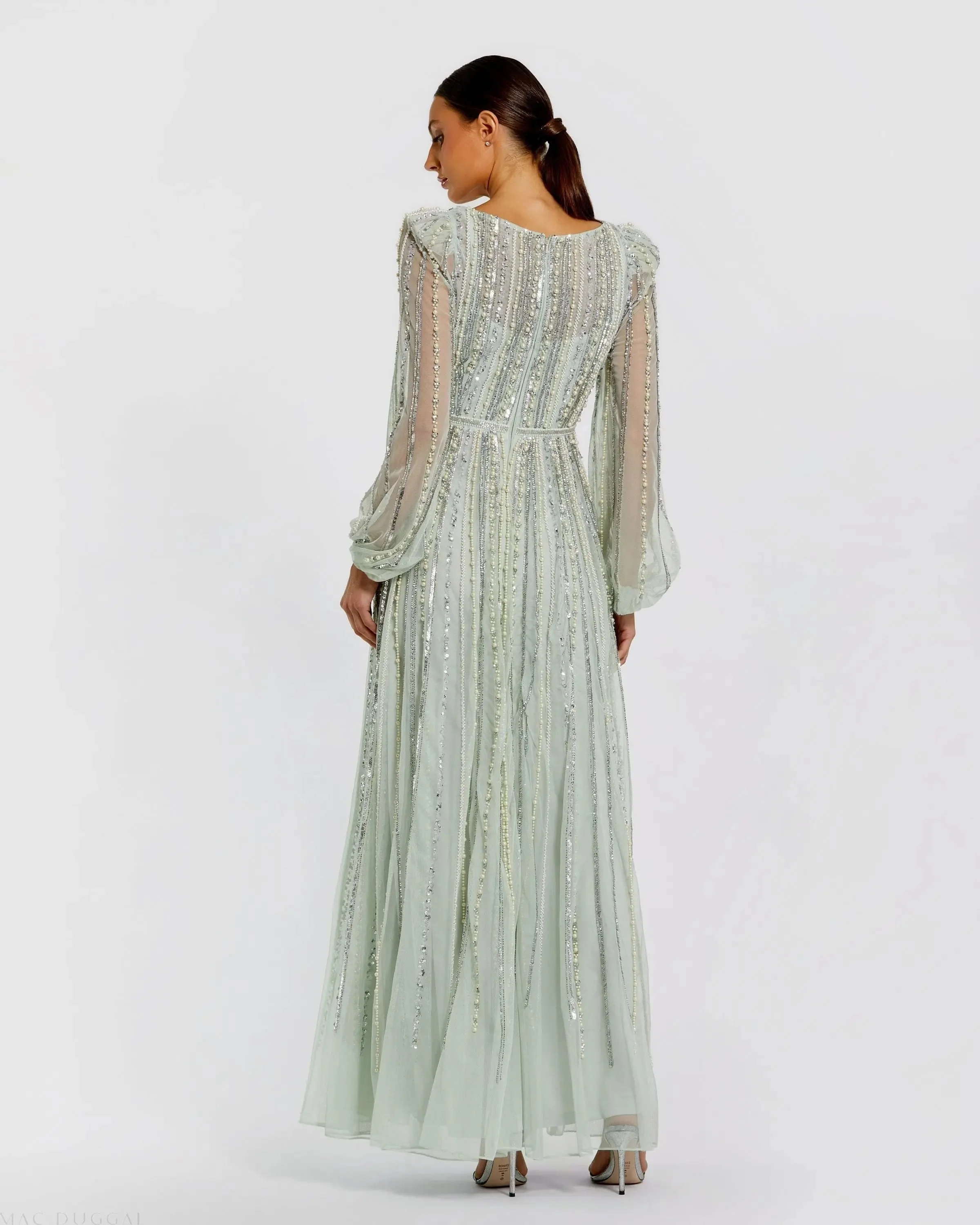 Green Boat Neck Long Sleeve Beaded Gown