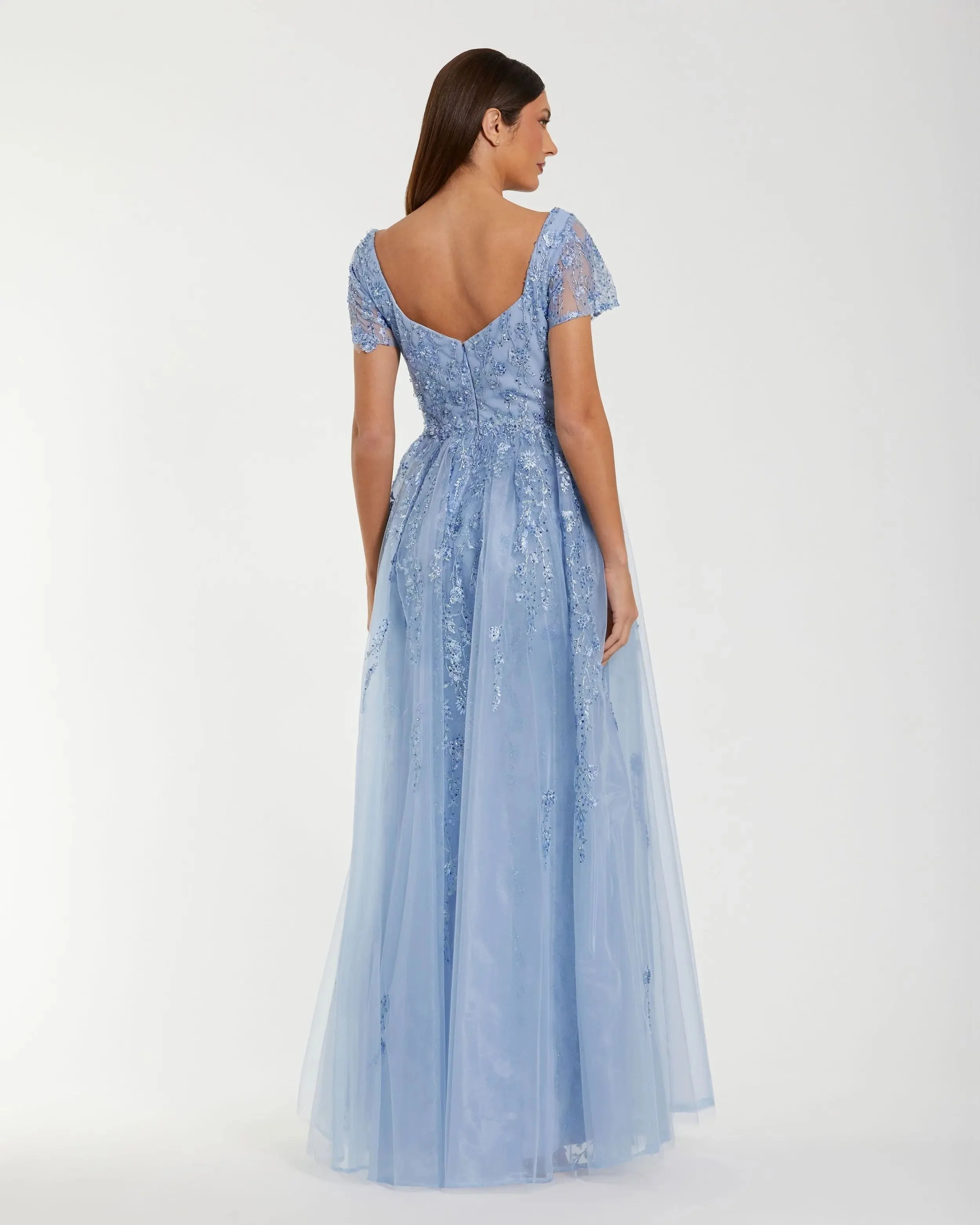 Blue Embroidered Beaded A-Line Gown with Overskirt