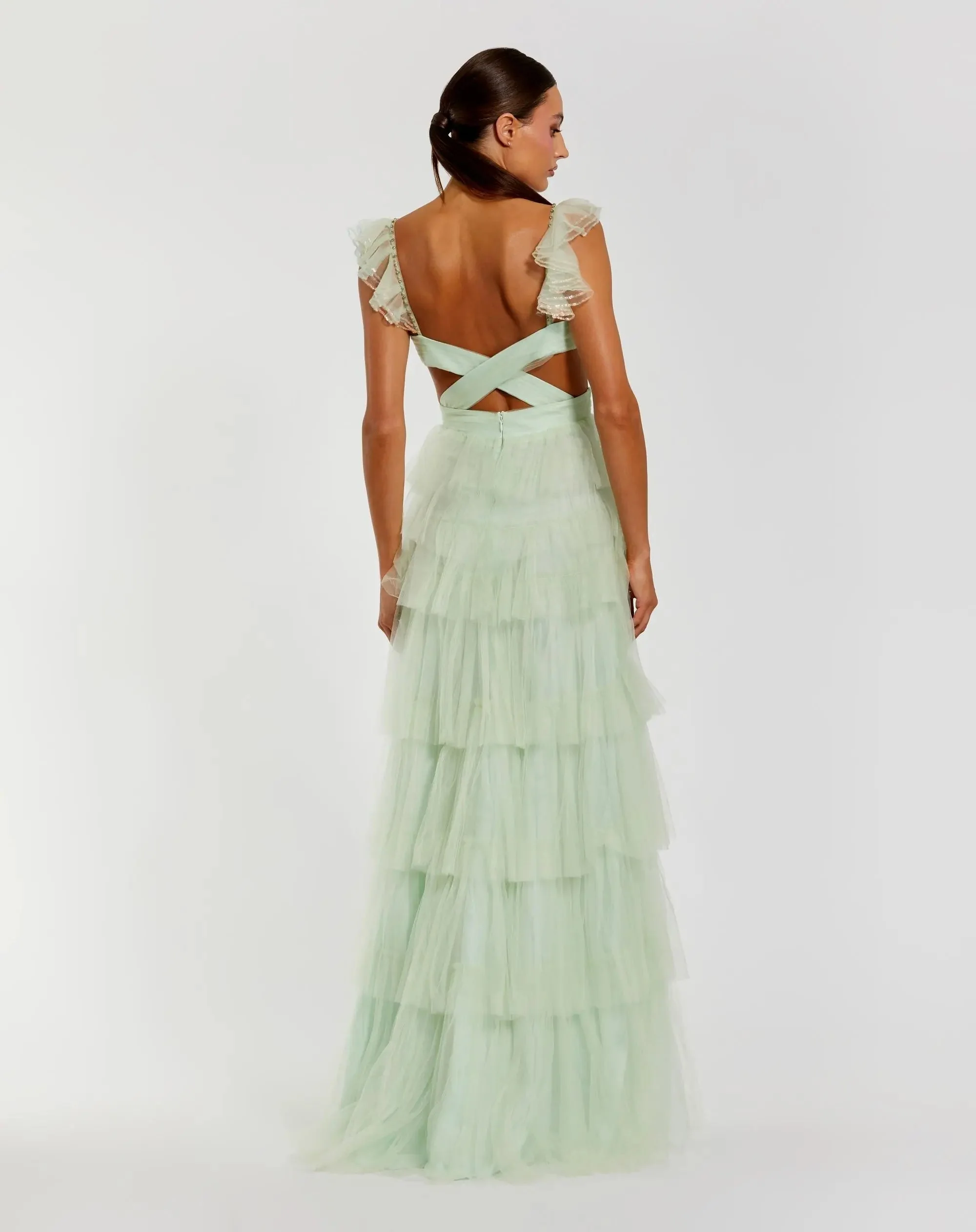 Blue Embellished Net Tiered Ruffle Scoop Neck Dress