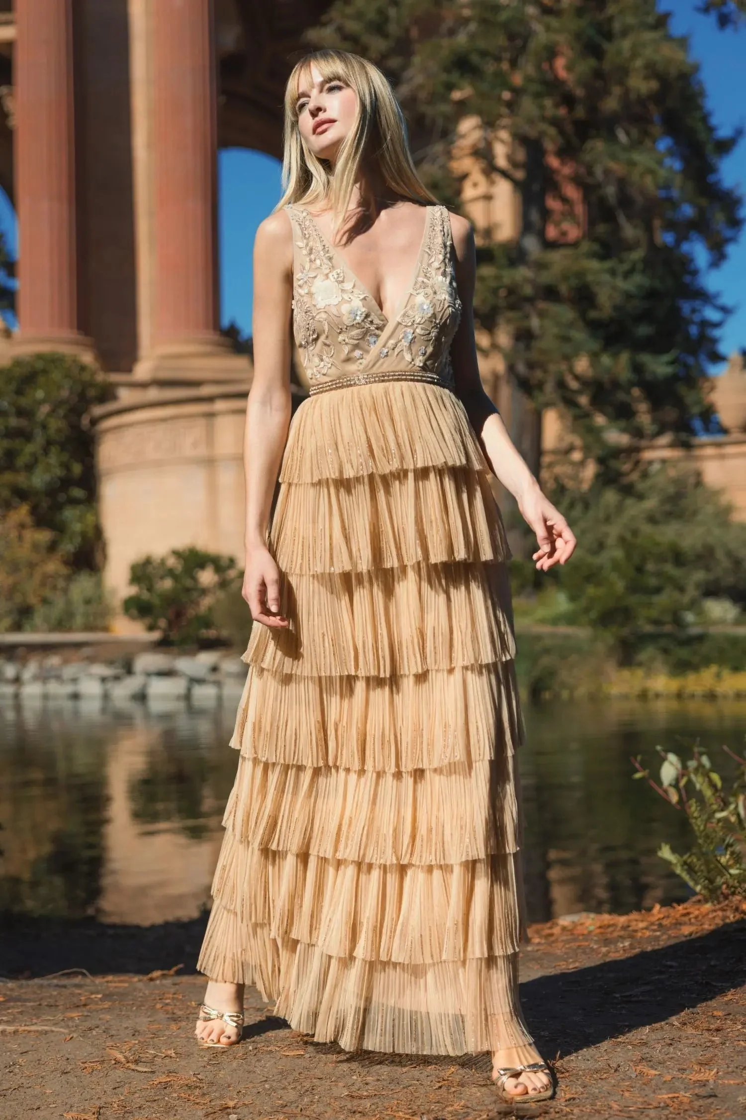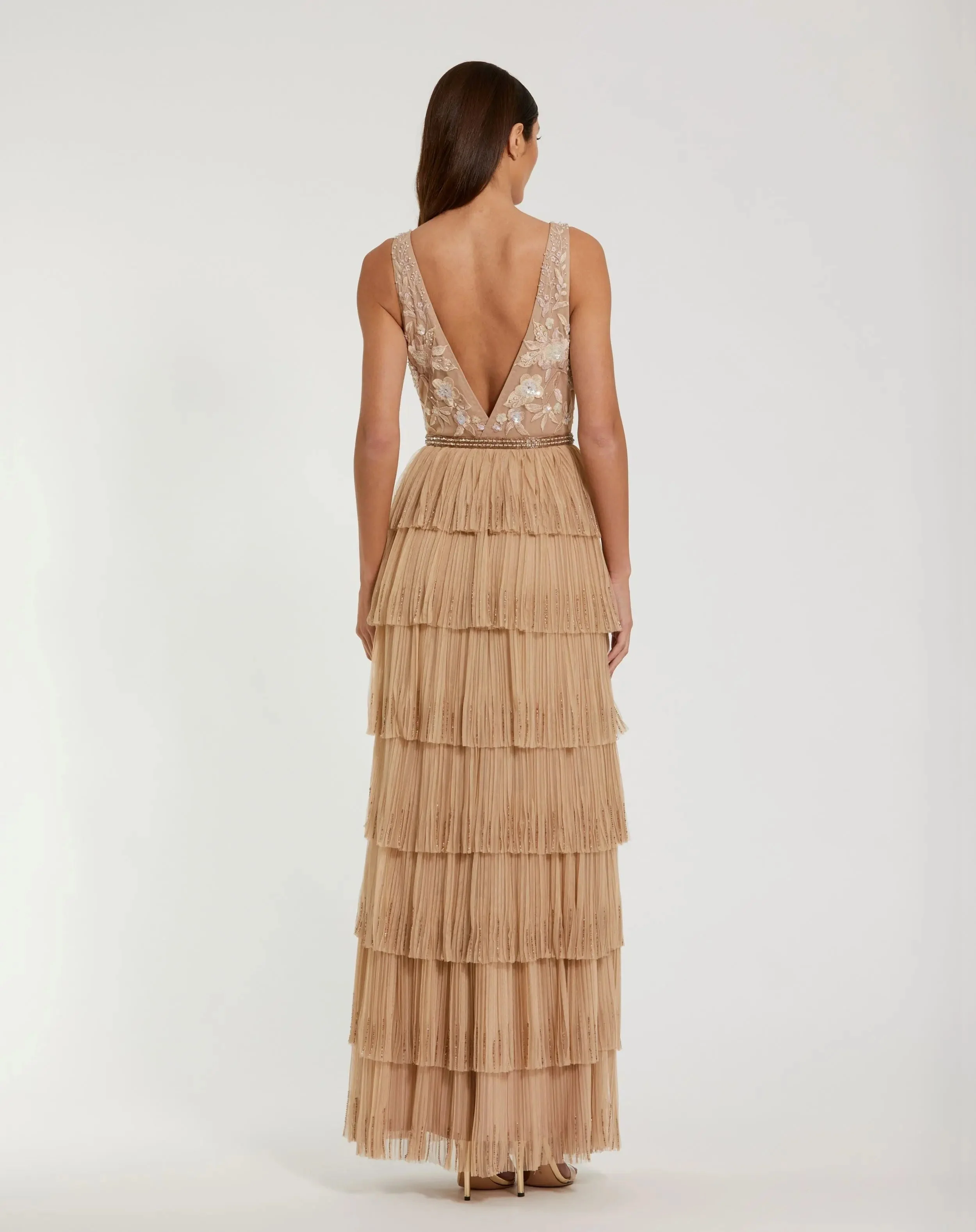 Beige Beaded Mesh V Neck Gown With Tiered Ruffles