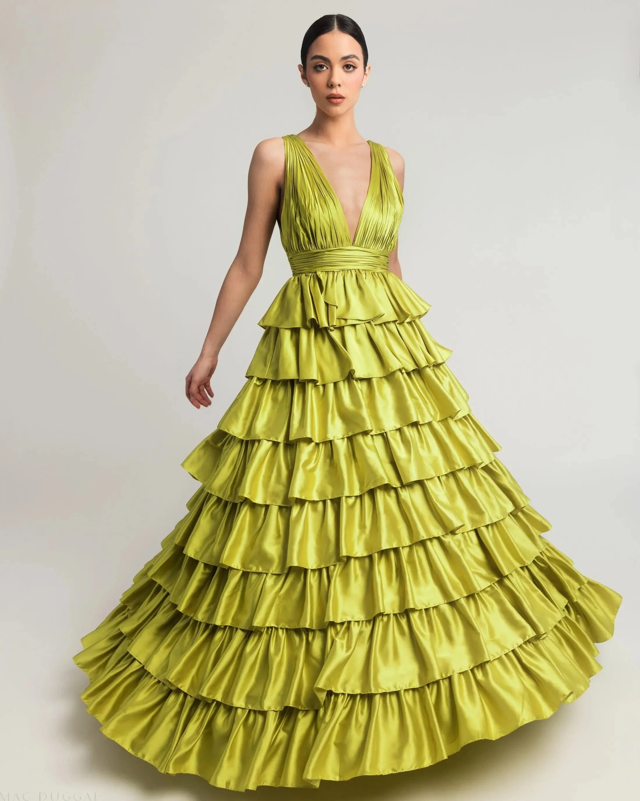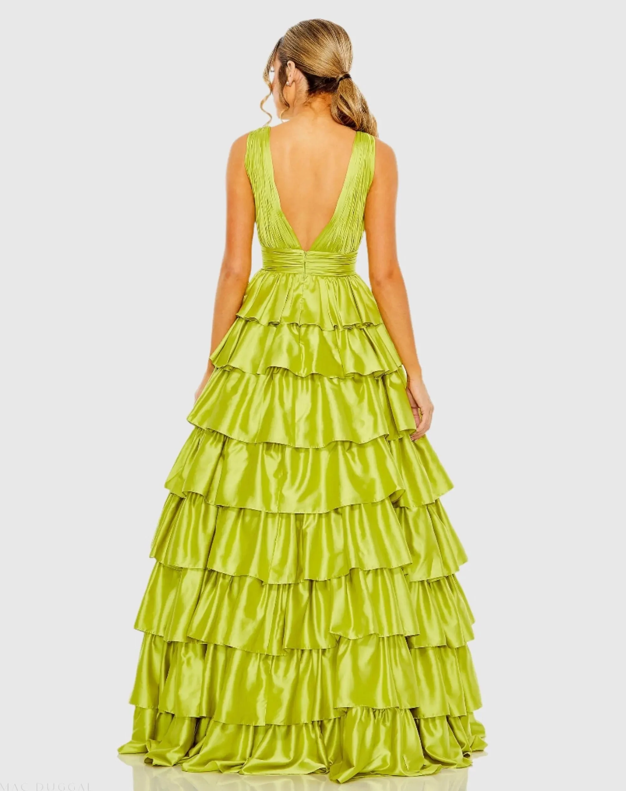 Green Ruffle Tiered Pleated Sleeveless V Neck Gown