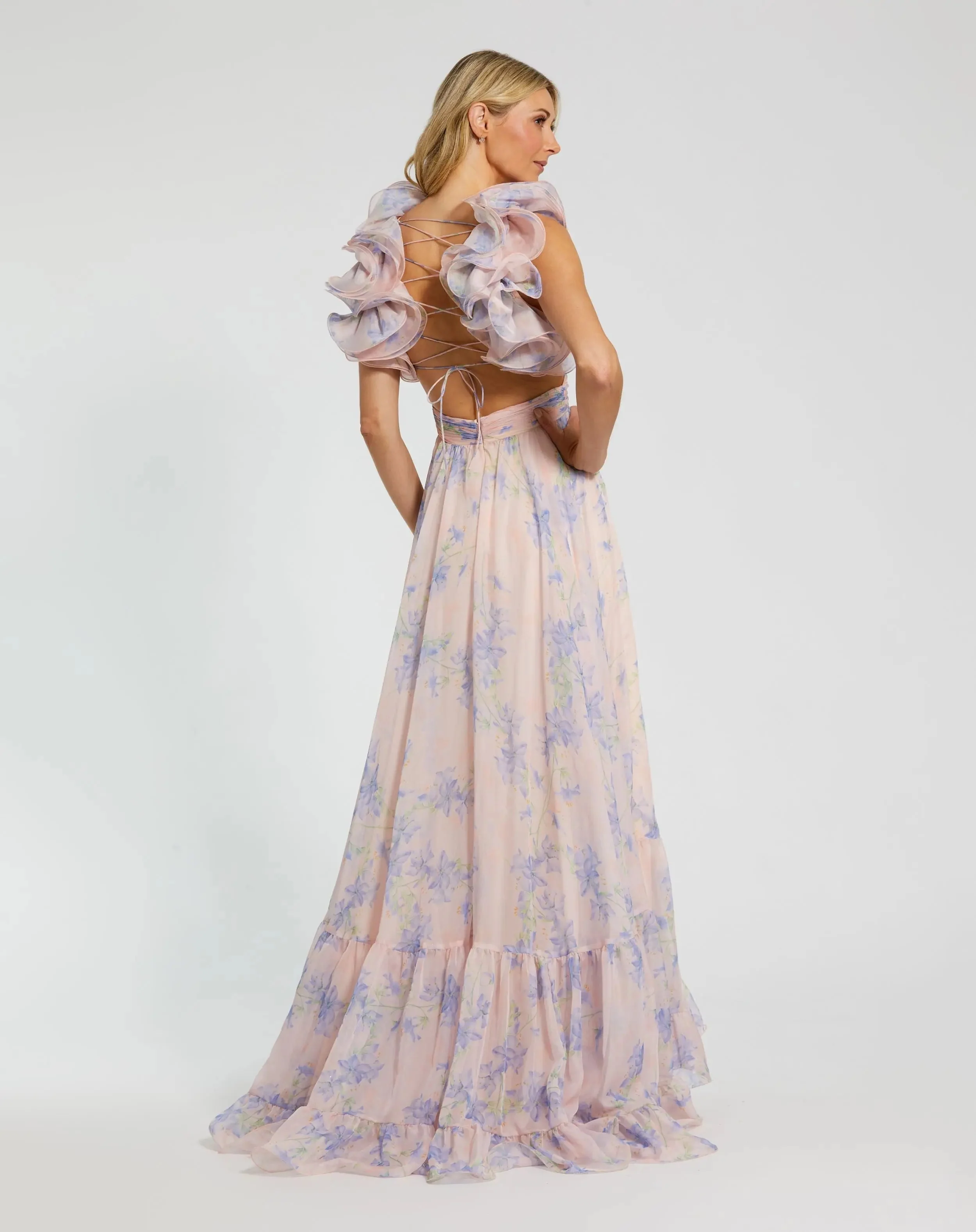 Pink Ruffle Tiered Cut-Out Chiffon Floral Dress