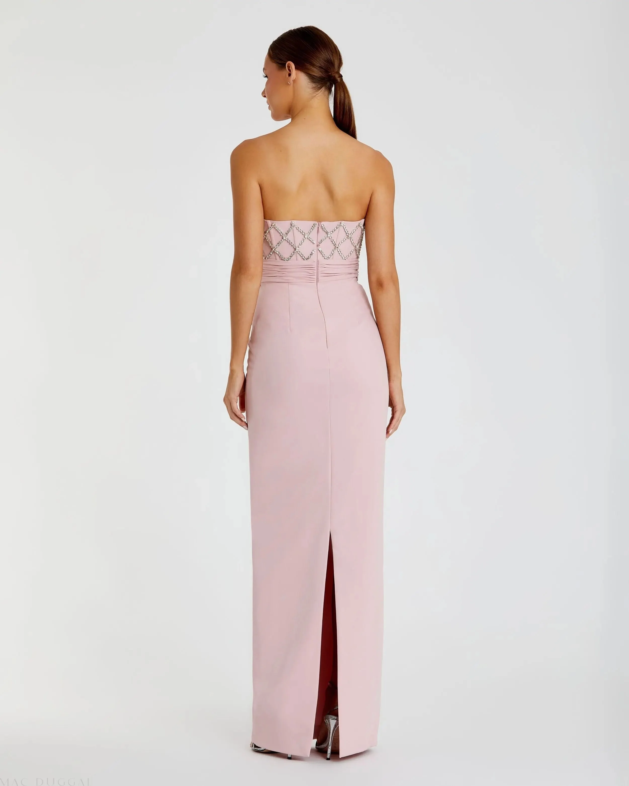 Pink Strapless Crepe Embellished Bustier Gown With Bow