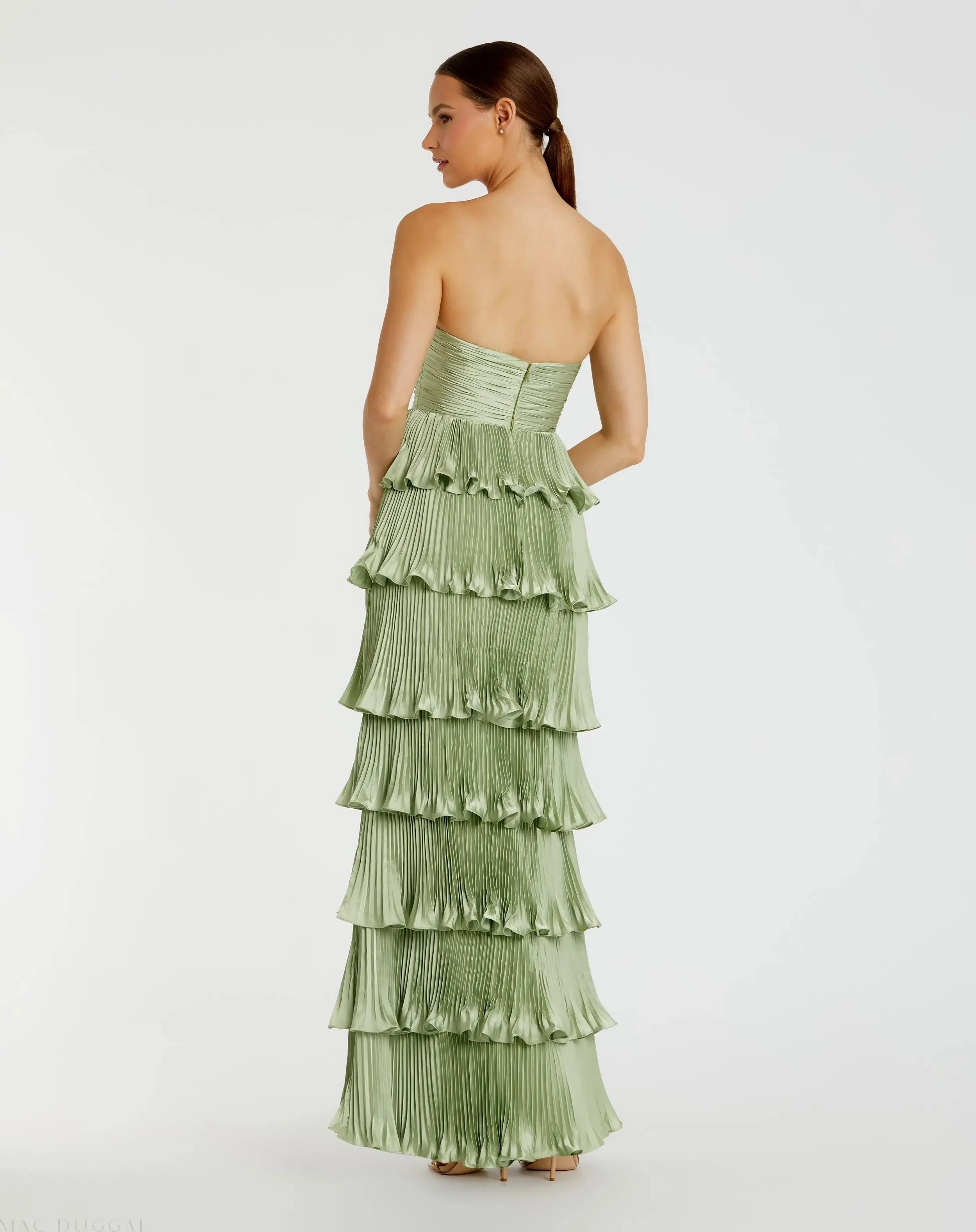 Green Pleated Charmeuse Strapless Tiered Ruffle Gown