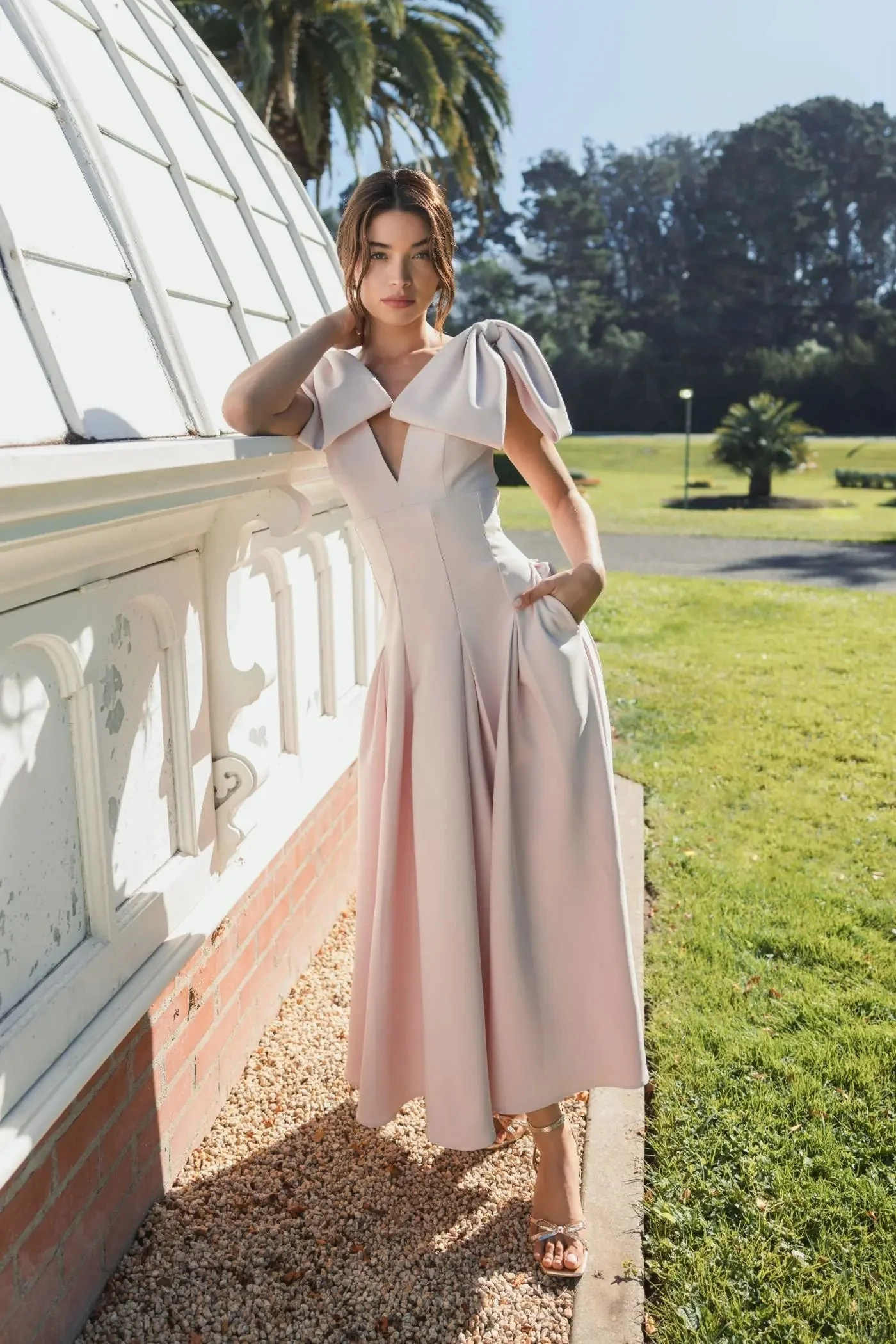 Pink Crepe A Line Midi Dress With Bow Straps