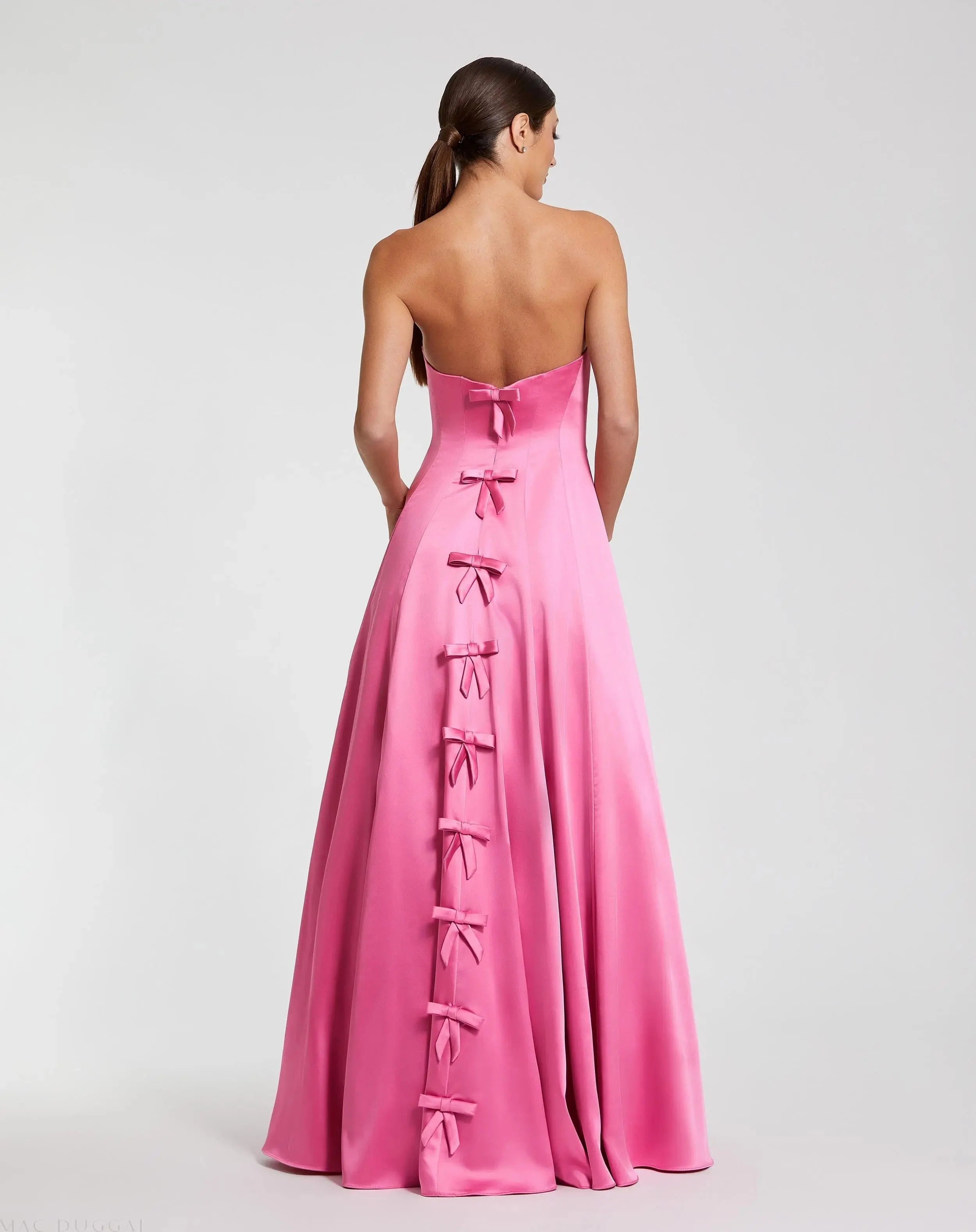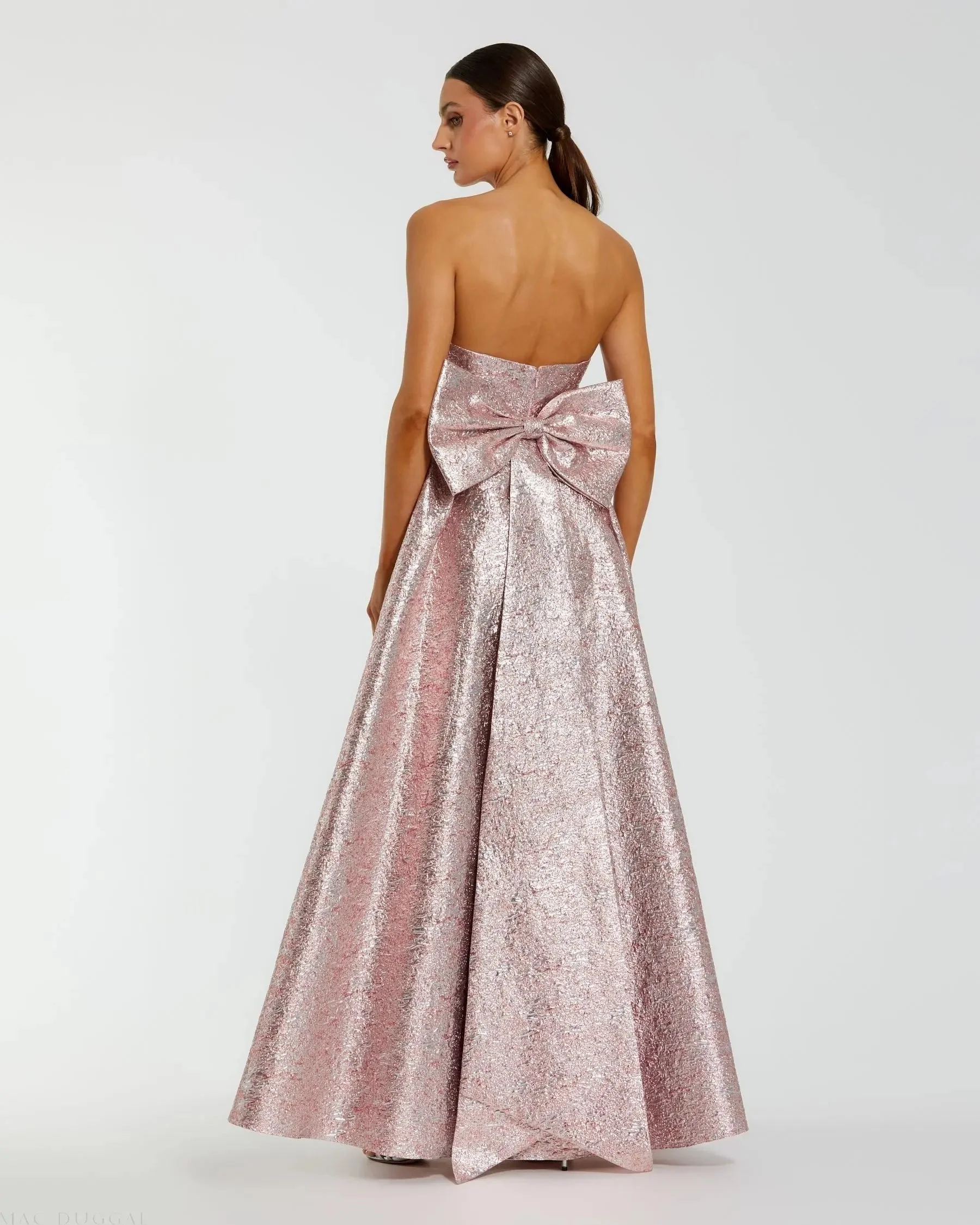 Pink Metallic Strapless Brocade Gown With Oversized Bow