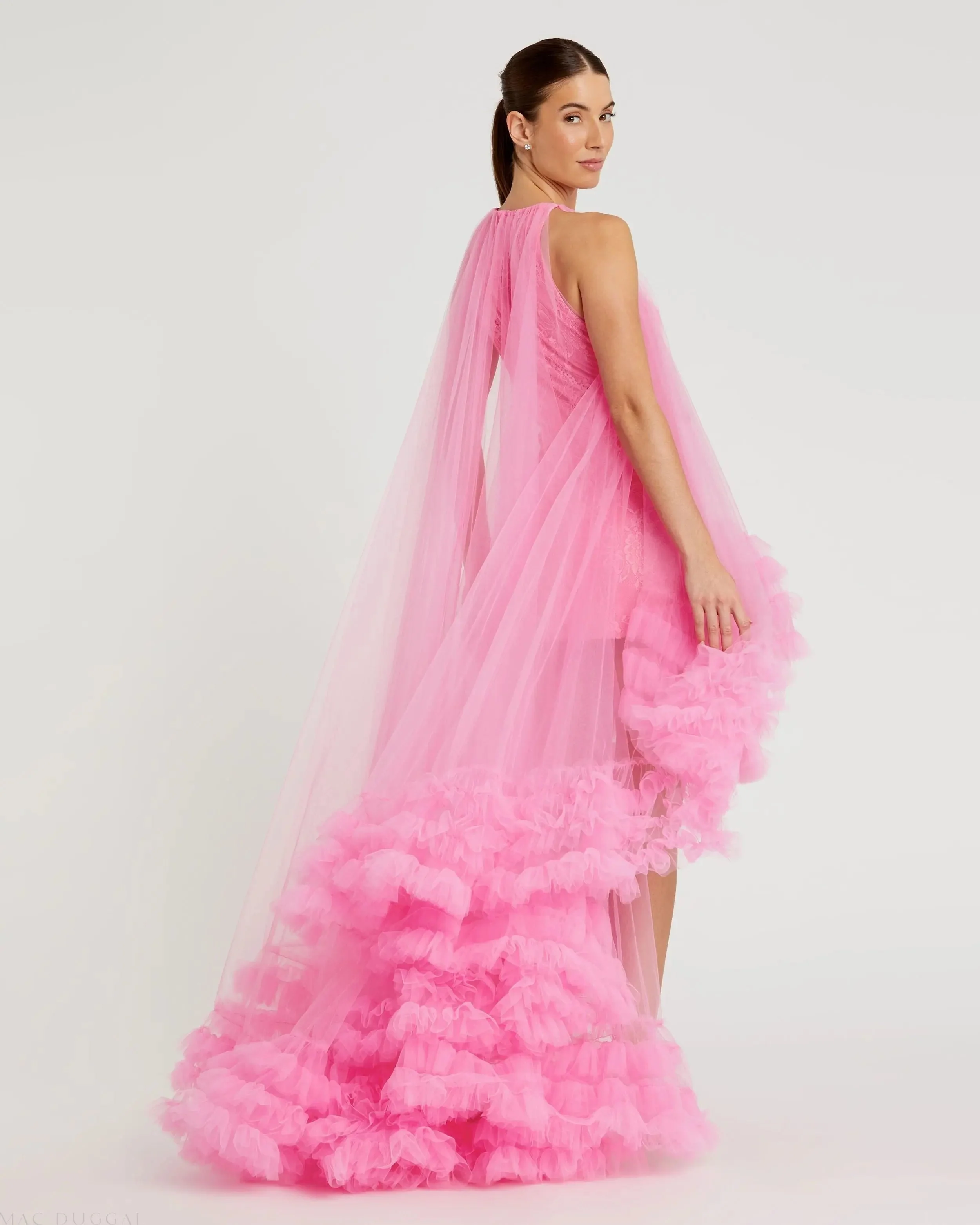 Pink Tulle High Neck Sleeveless Ruffled Hem Hi-Low Gown