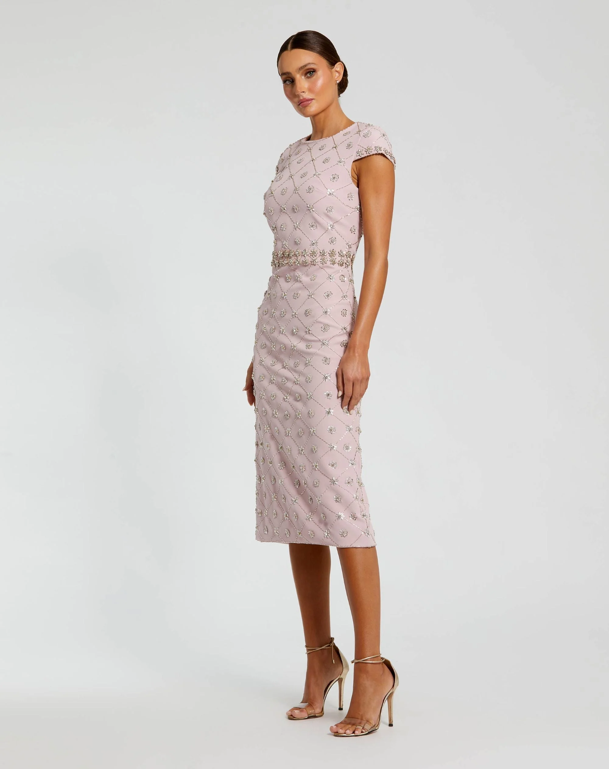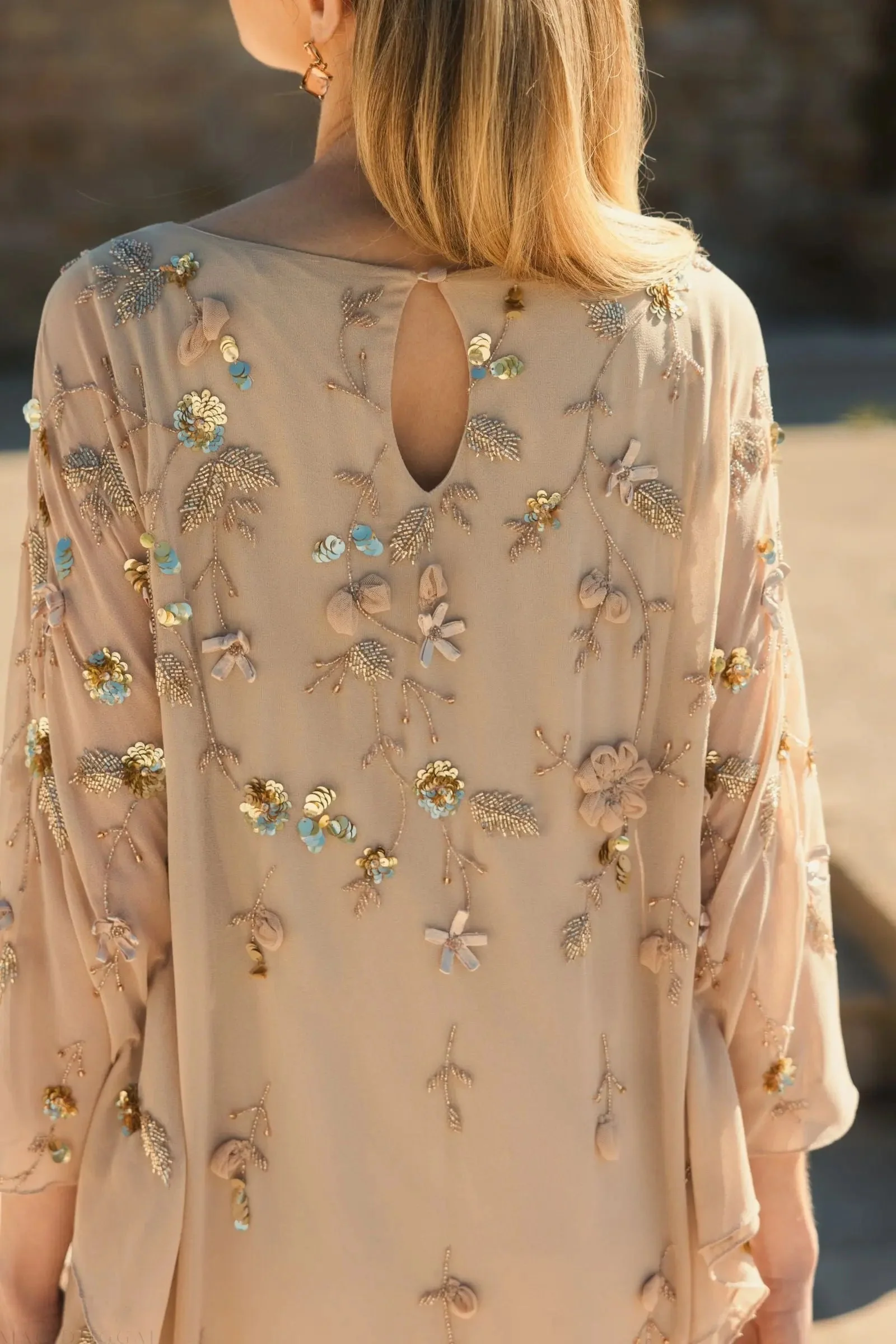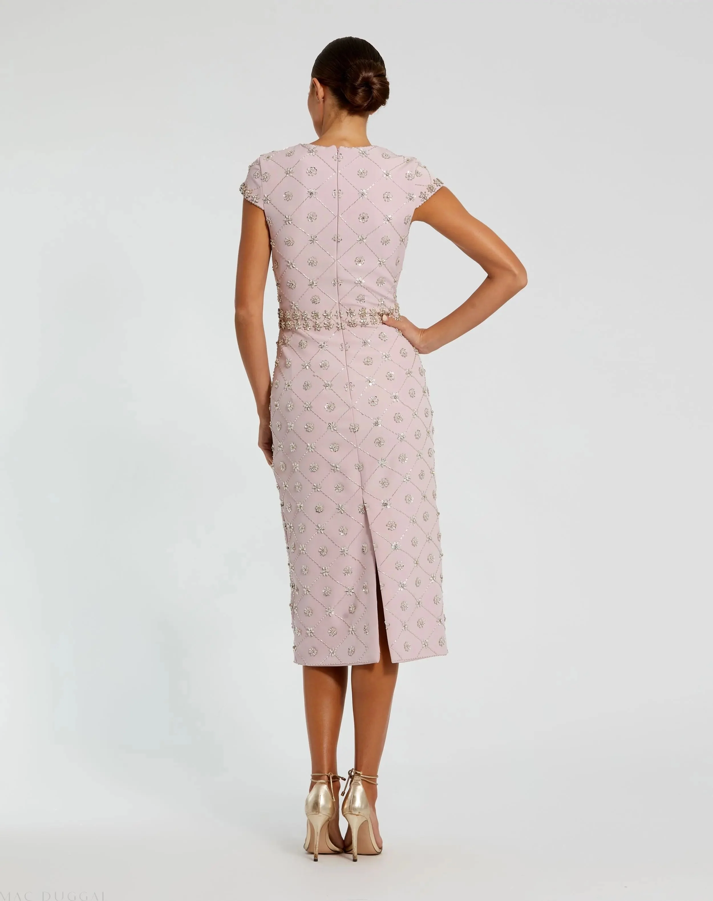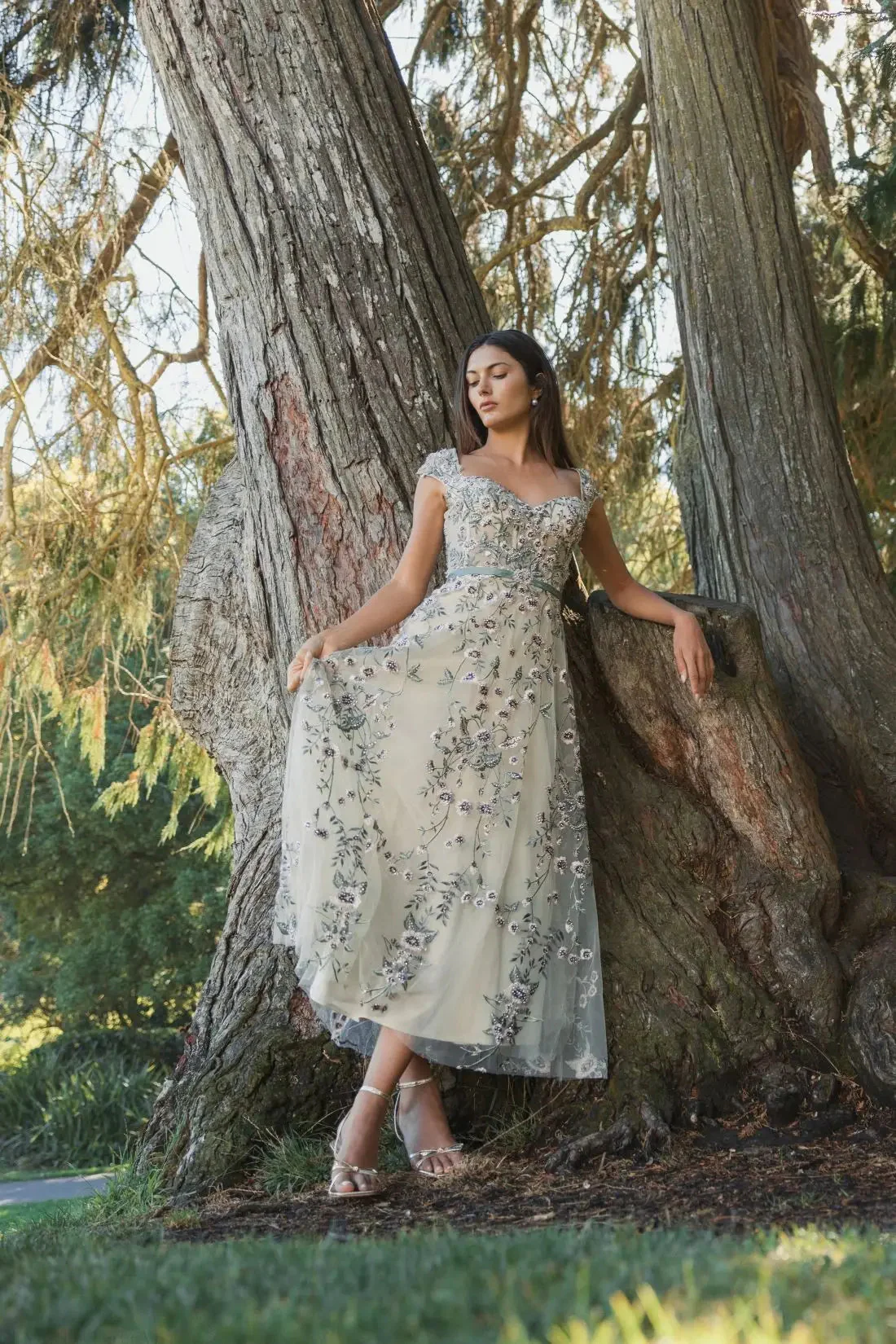 Ivory Floral Embroidered Sweetheart Neckline Midi Dress