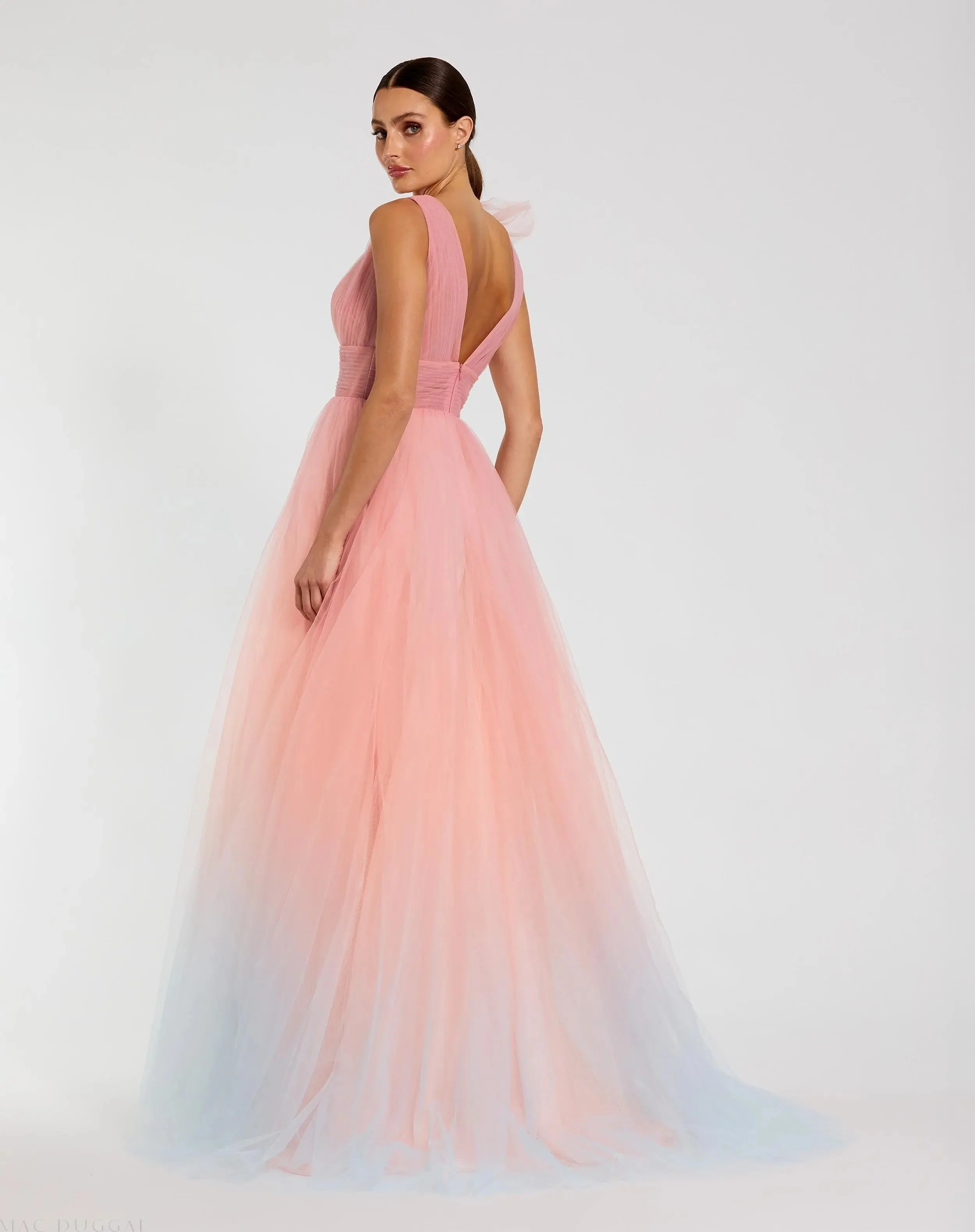 Pink Ruffle Shoulder V Neck Ombre Tulle Ballgown