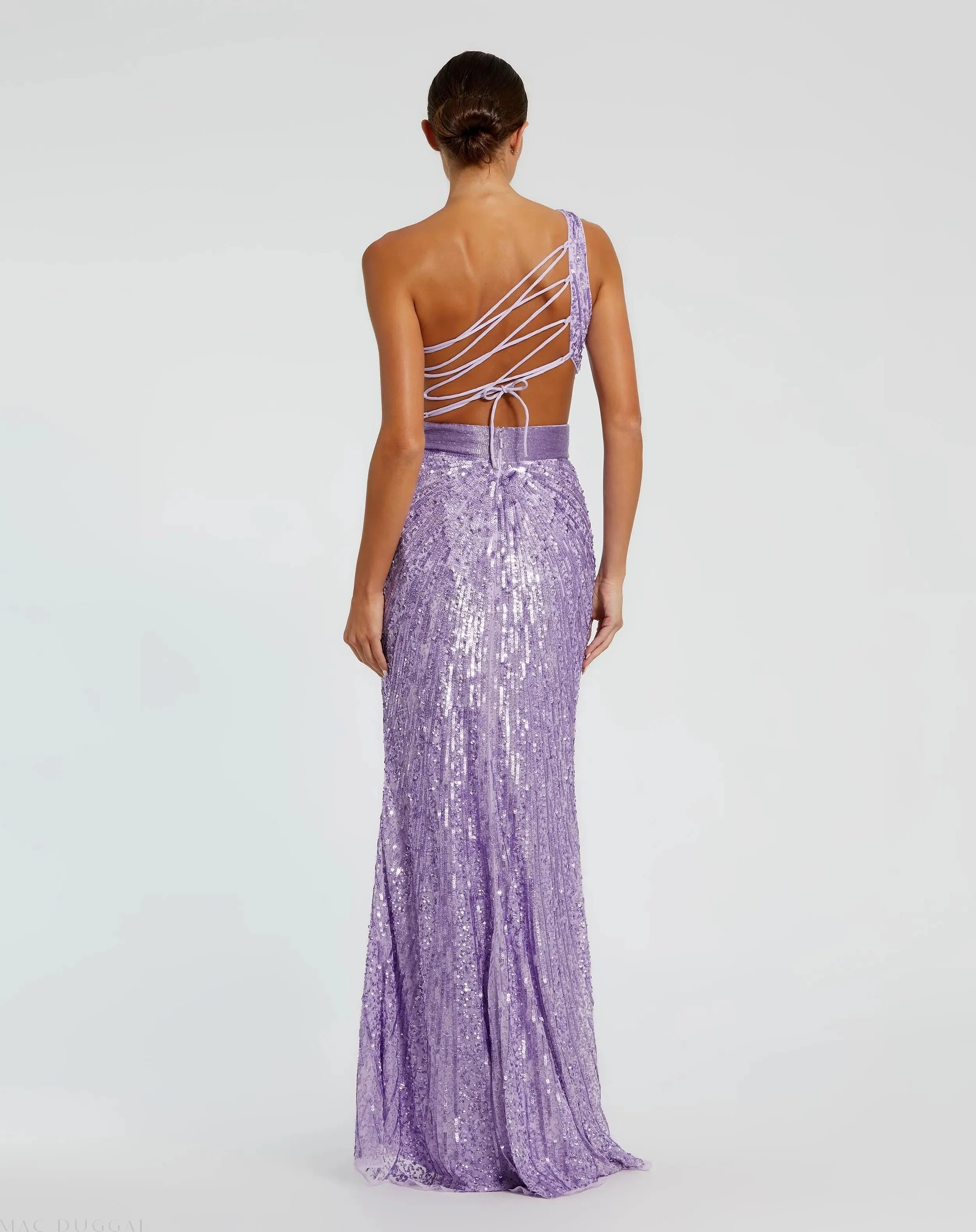 Purple Sequined One Shoulder Draped Lace Up Gown