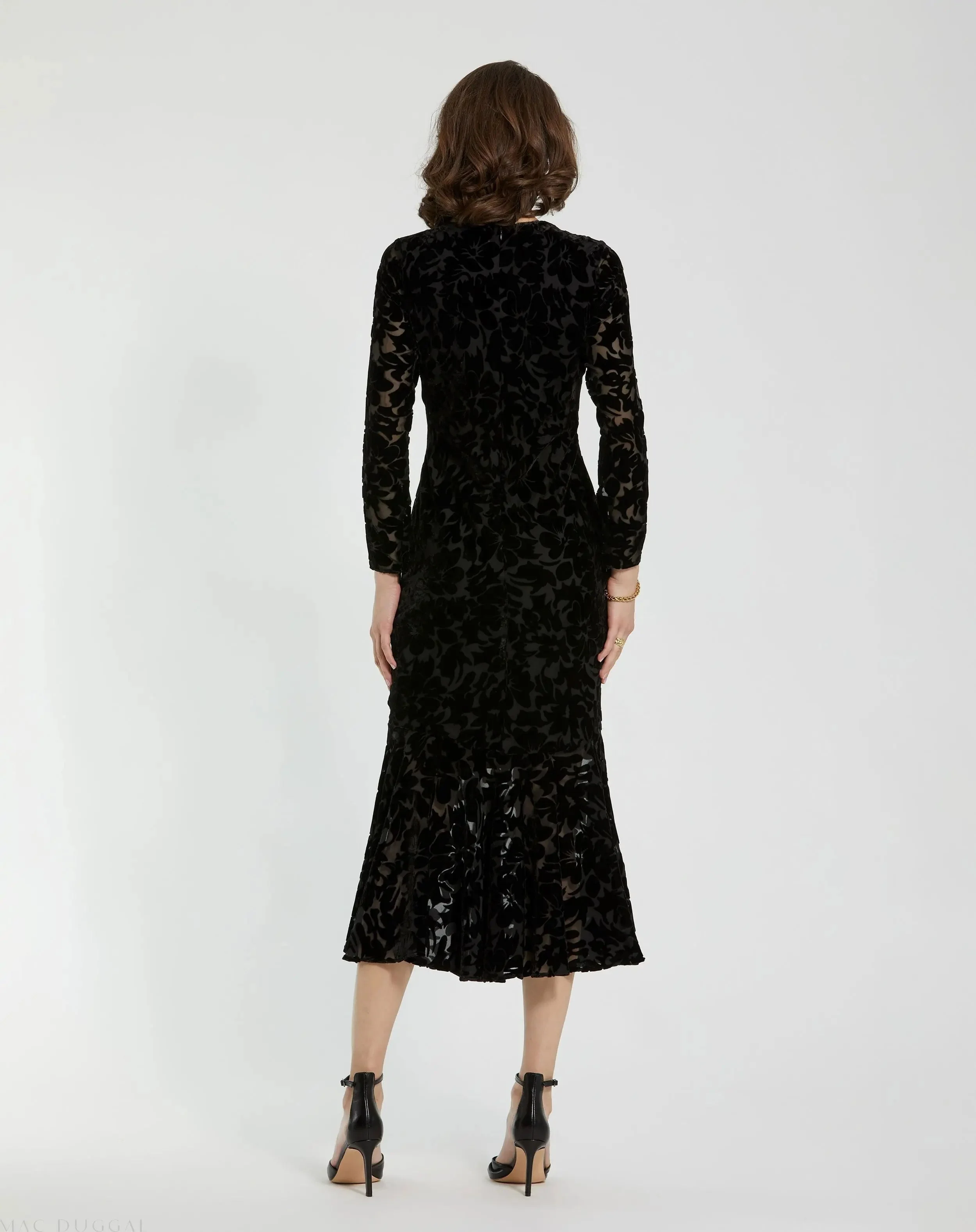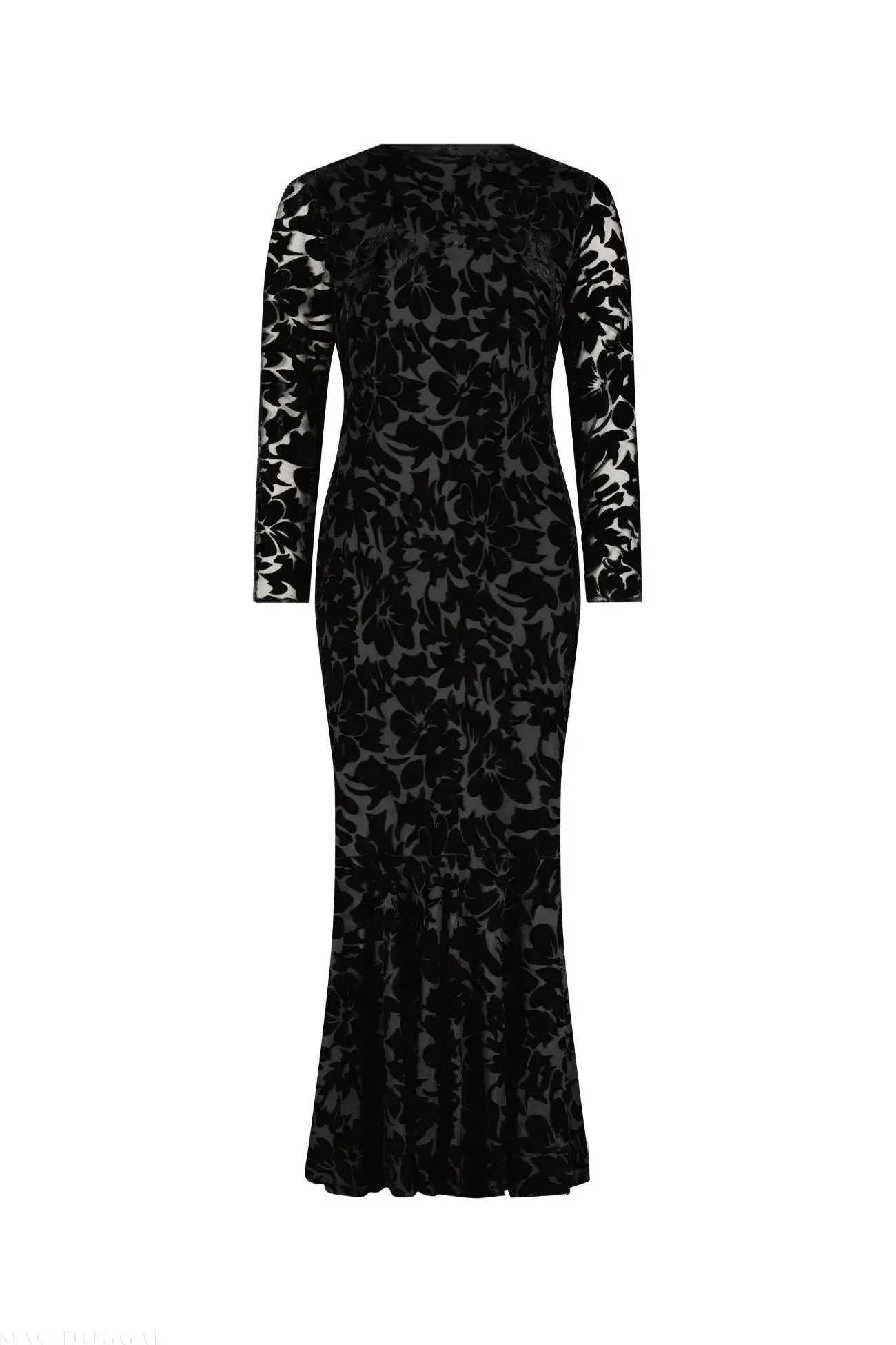 Black Burnout Velvet Long Sleeve Ruffle Hem Midi Dress