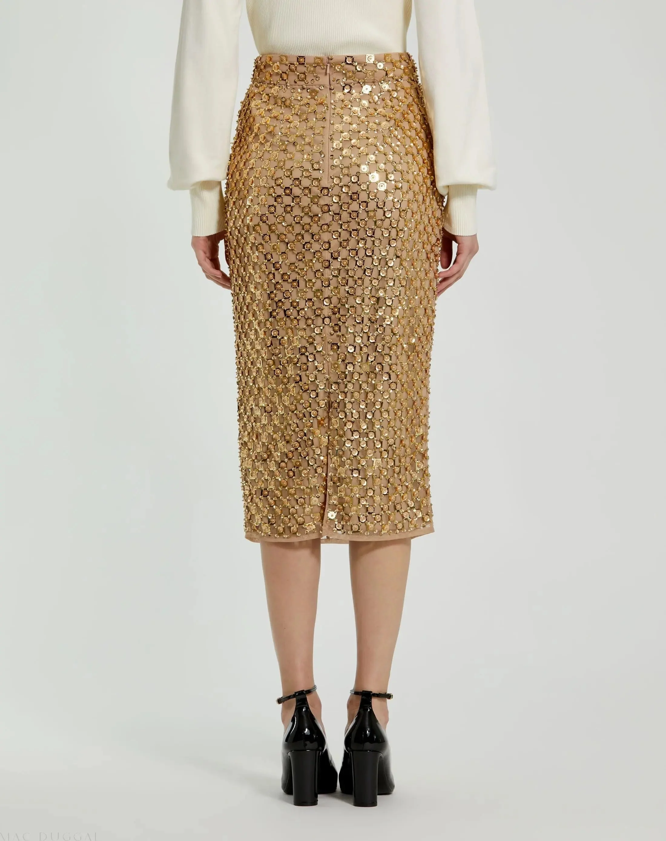 Gold Georgette Embellished Fitted Midi Pencil Skirt
