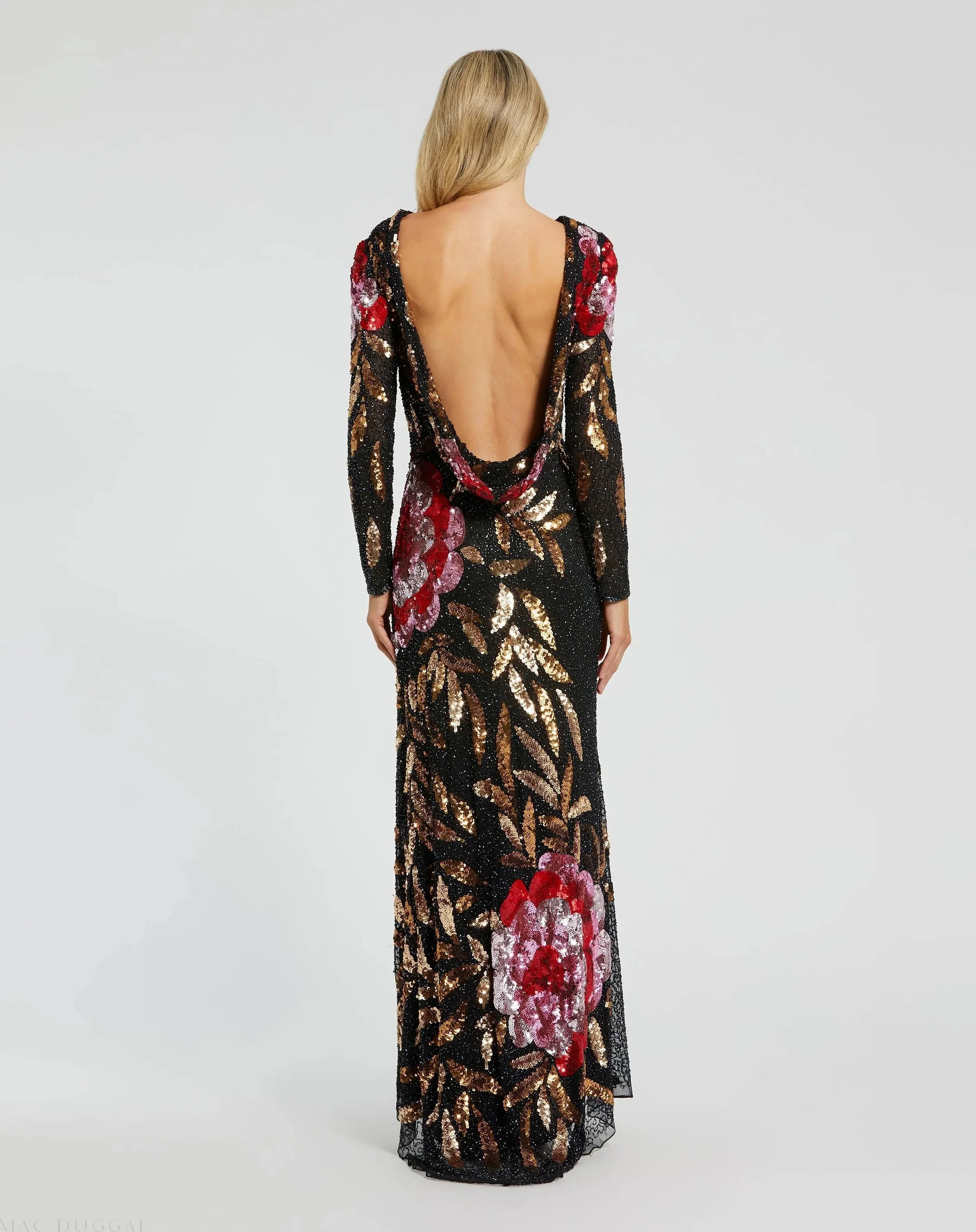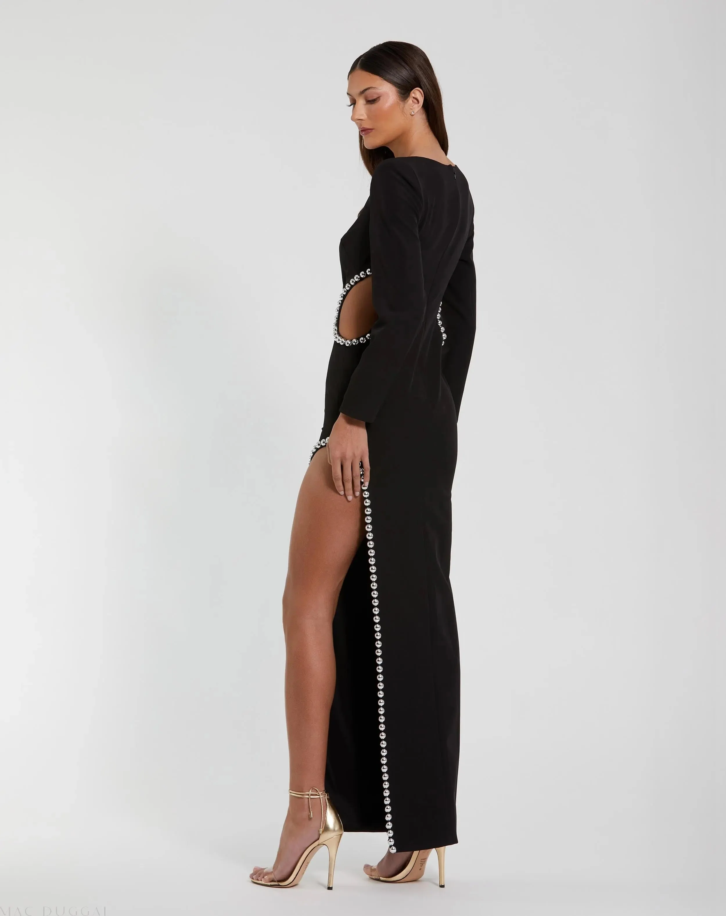 Black Crepe Long Sleeve Gown With Beaded Cut Outs