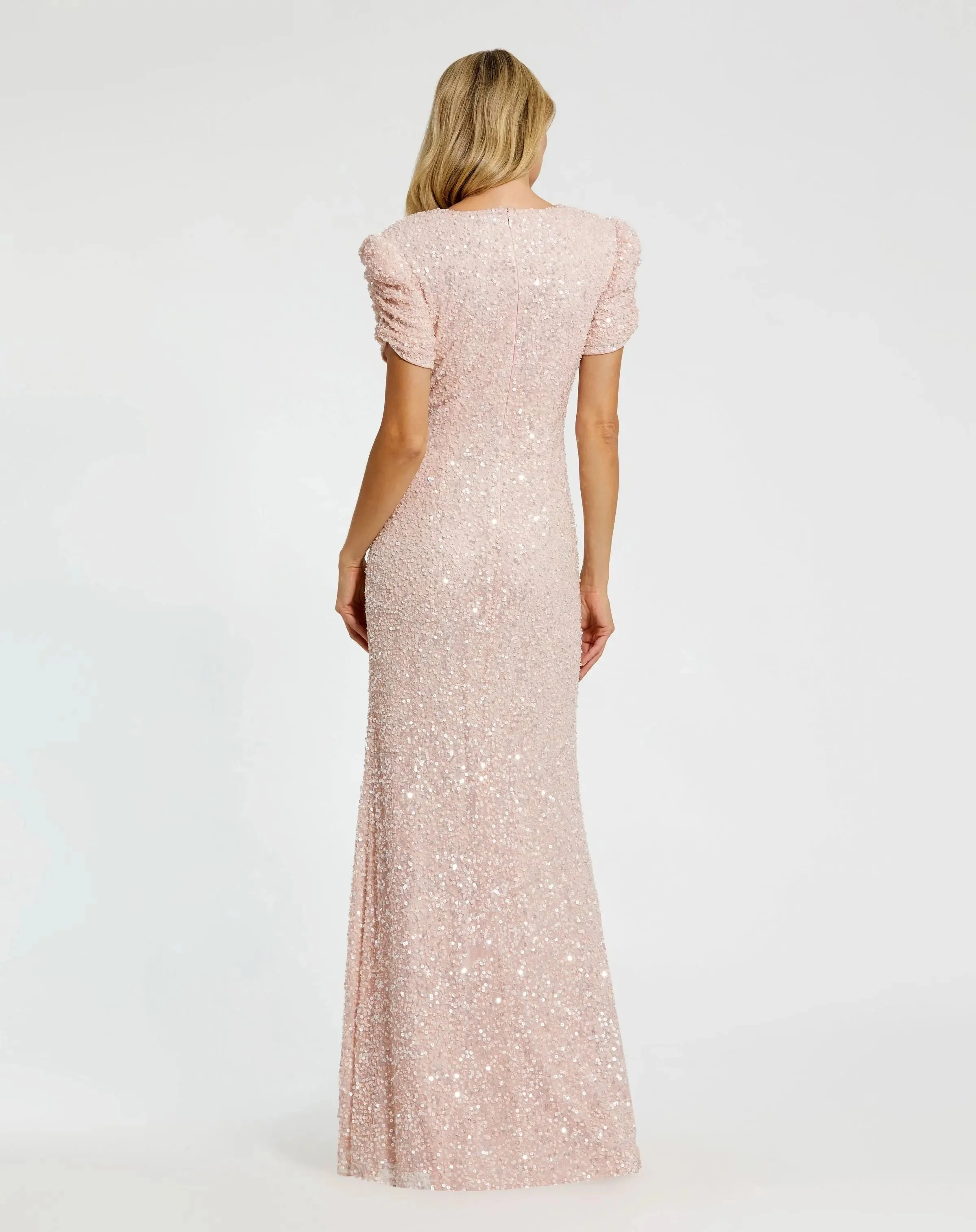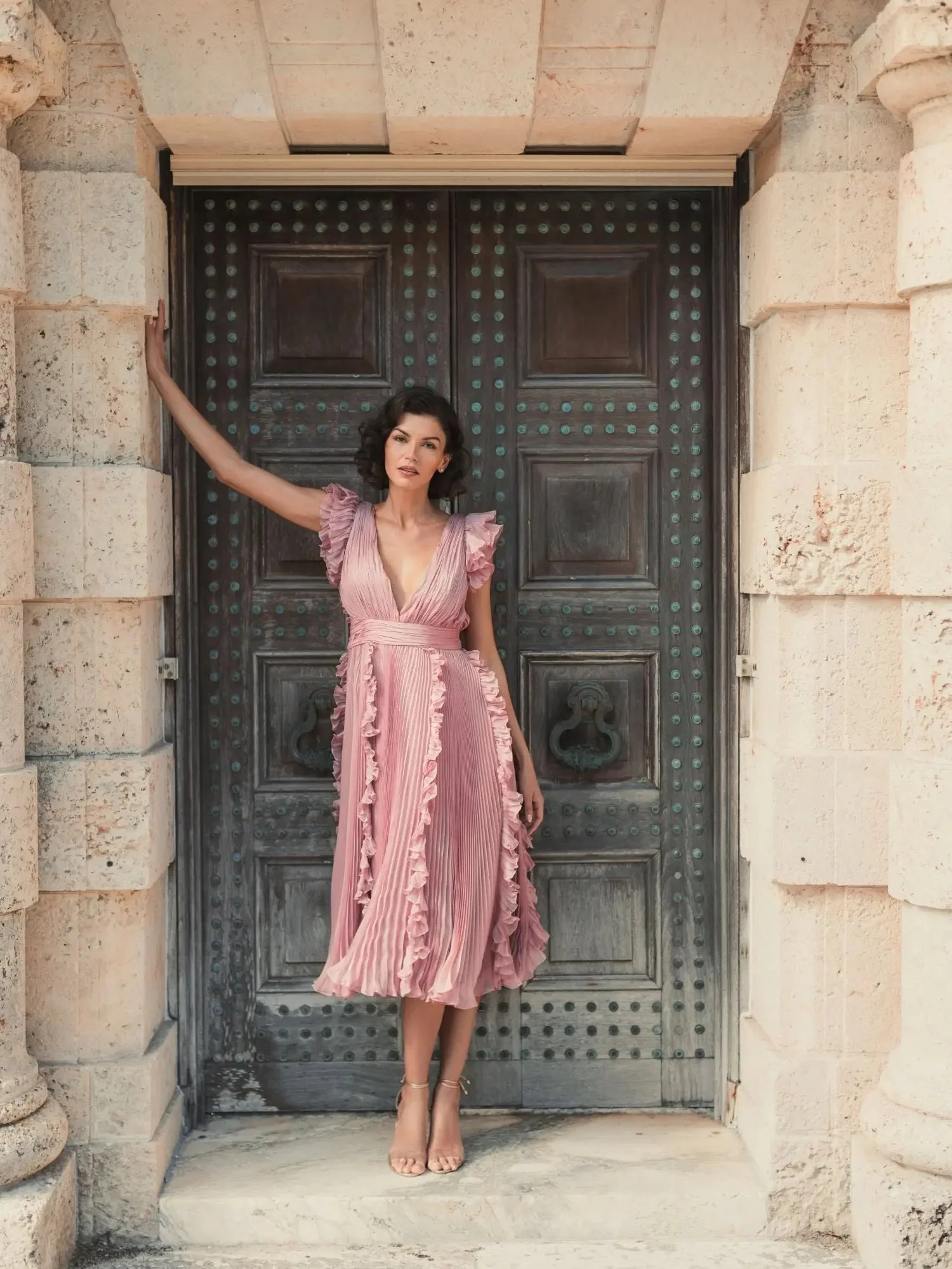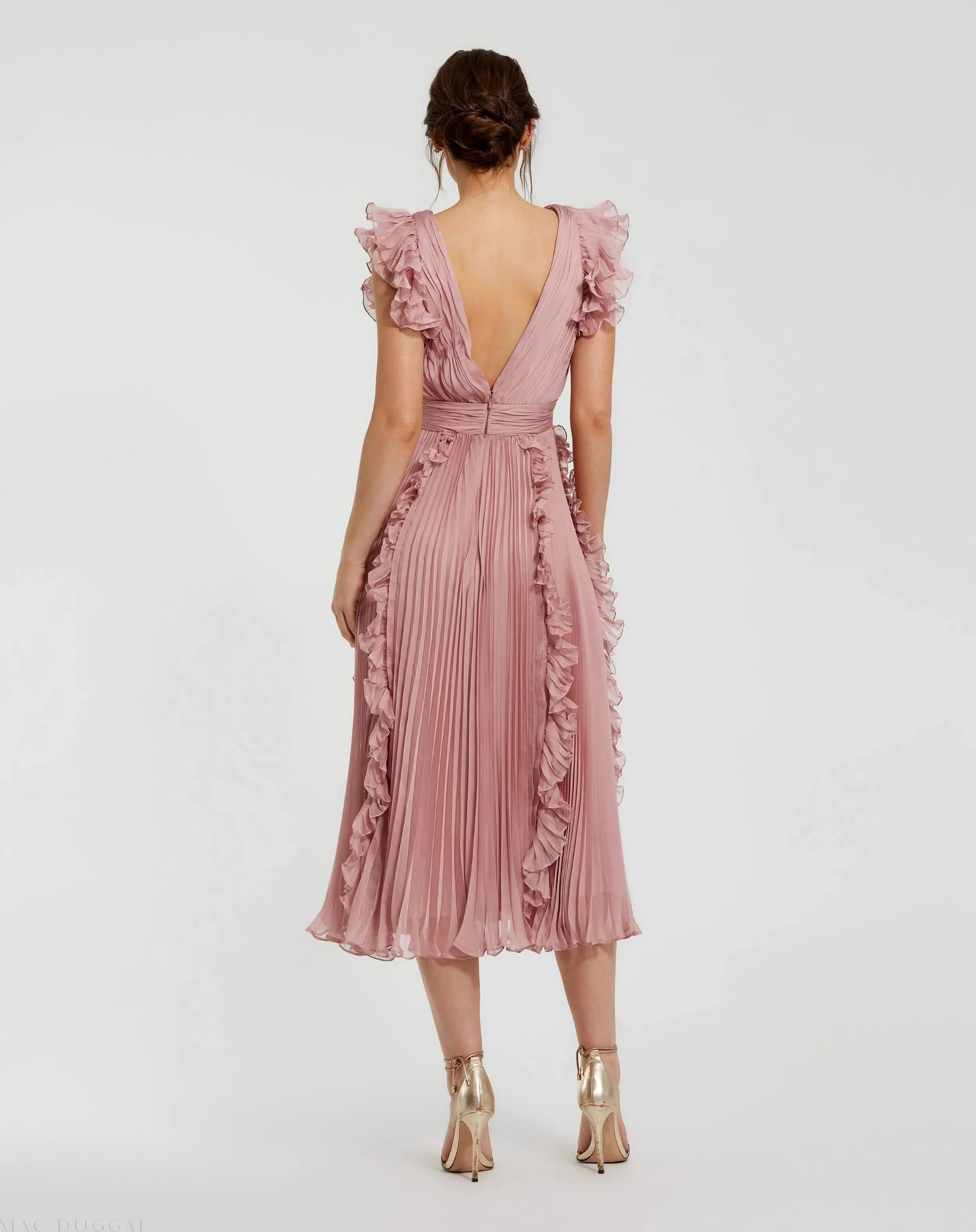 Pink Pleated Chiffon V Neck Ruffle Midi Dress